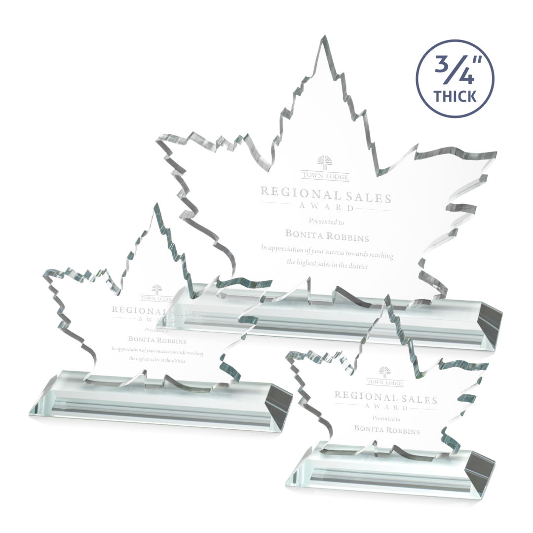 Stunning Starfire Crystal formed into a beautiful maple leaf with acid polished edges and mounted on top of a Clear mitered base. A great symbol of Strength, Perseverance and Canadian Pride. Let your message POP with full color VividPrintâ„¢. 7.0″ W x 6.75″ H x 3.0″ D