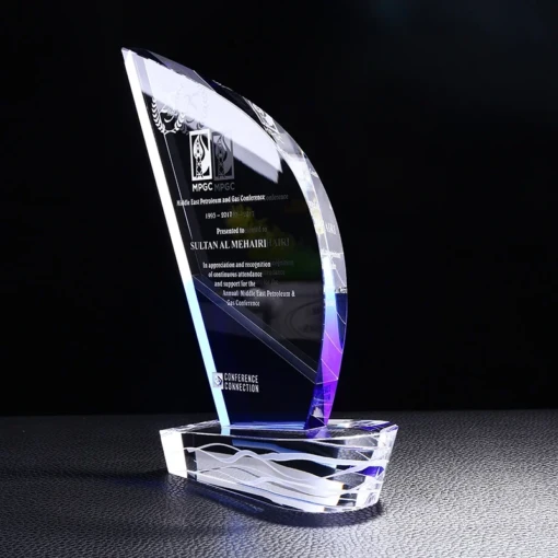 The Mariner Flair is designed as an abstract version of a Sailboat Hull and Sail. The Sail is a combination of Clear and Blue Optic Crystal and it is bonded to a thick Clear Optic Crystal Hull. The Sail provides a large engraving area. 5.5″ L x 0.4″ W x 7″ H