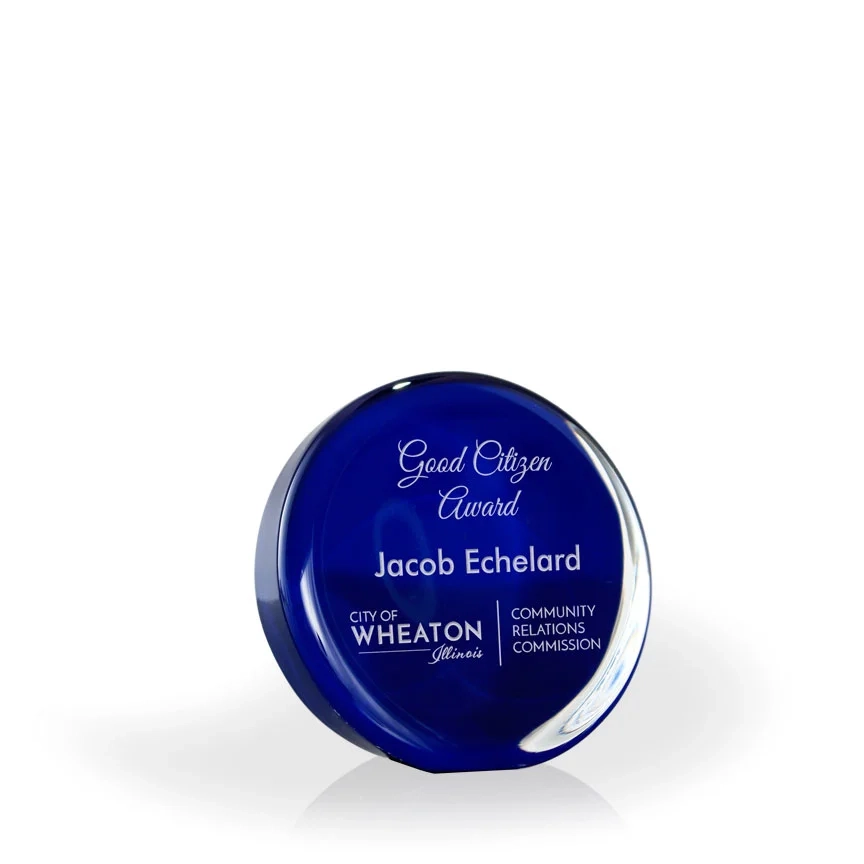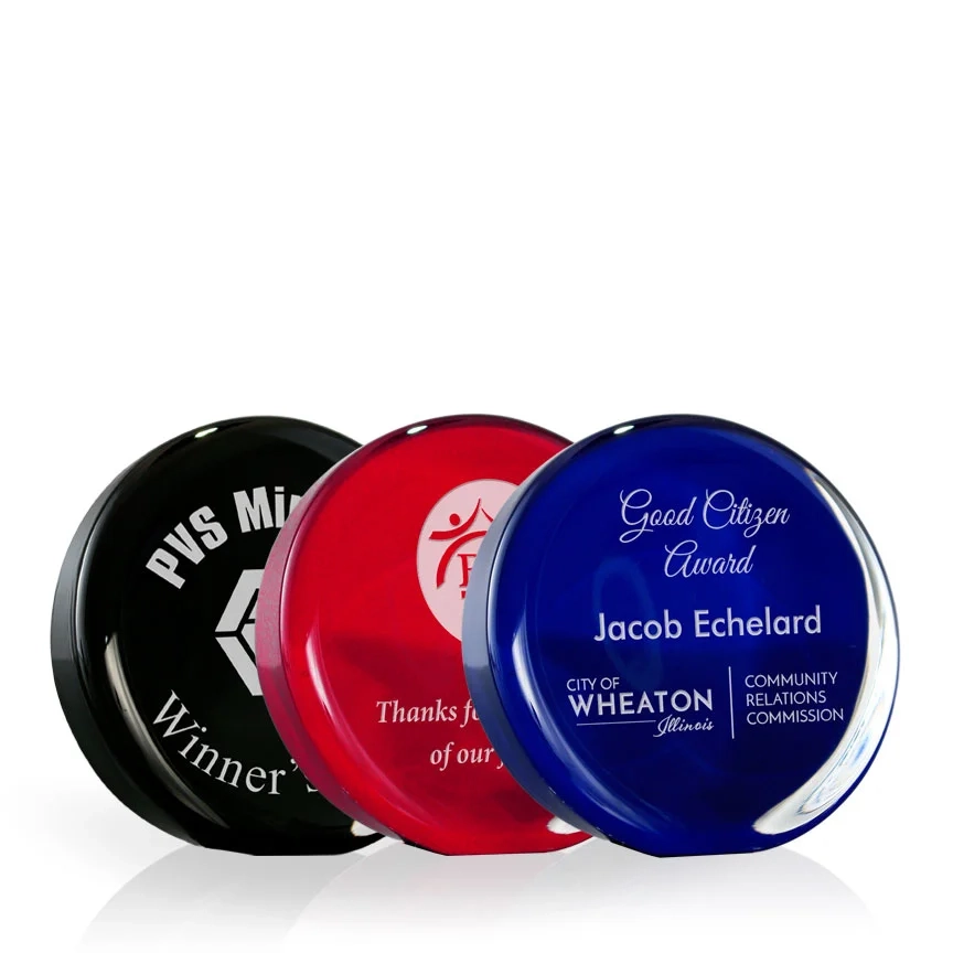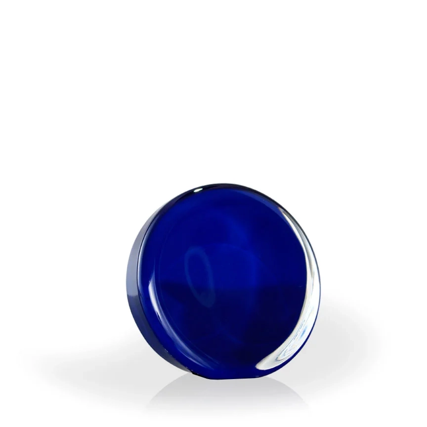 The Marla Colored Glass Disc is a 3.5″ molded glass circle with a flat edge to stand on. Color is added to the back of the award, and your logo and text will be engraved on the front. Other colors (not shown) such as green and orange are available upon request. Each piece may be slightly different in color, shape, and size. Bubbles and swirls are a part of the process and are considered normal and acceptable. 3 1/2″ H x 3 1/2″ W x 1″ D