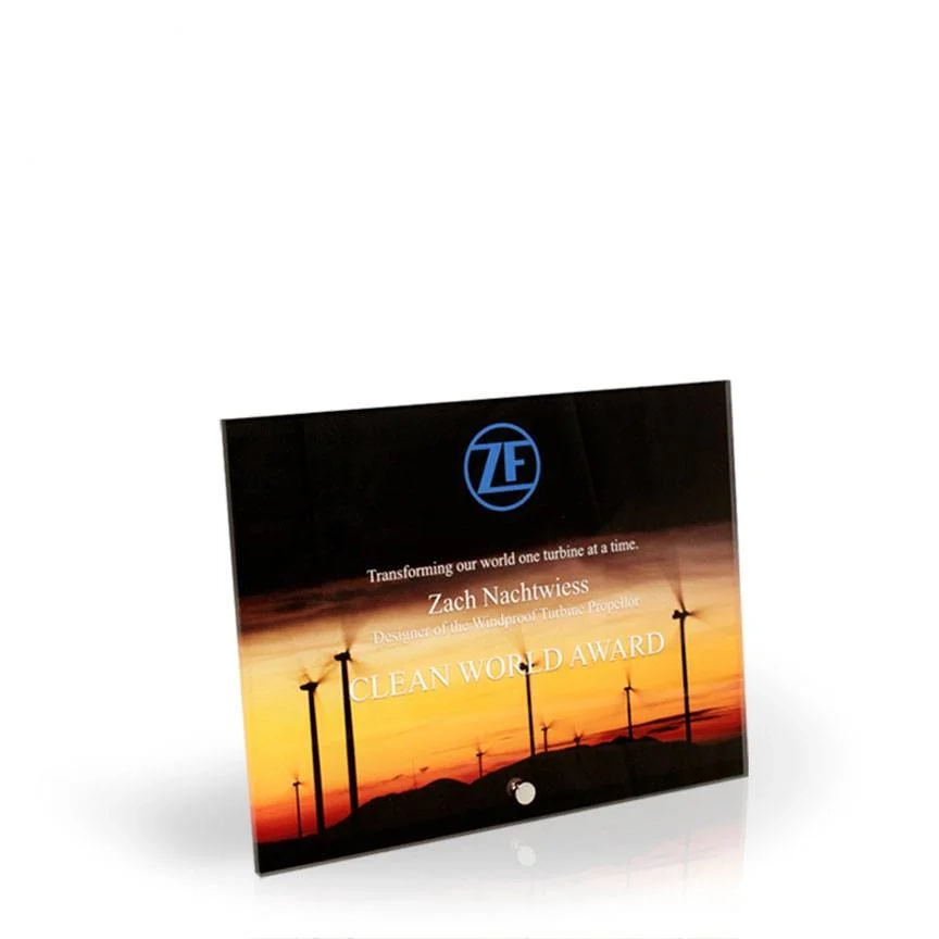 An attractive and affordable award option, our acrylic easel awards are made in the USA with 1/4″ clear acrylic and a 2″ silver-tone pin stand. These budget-friendly awards require minor assembly. The acrylic upright and silver-tone pin stand are packaged together, un-attached, in a slim-line white tri-fold box. NOTE: These awards are shown with sample art, but begin as blank, clear acrylic that can be customized with your logo, text, and graphics. 6″ H x 8″ W x 2″ D