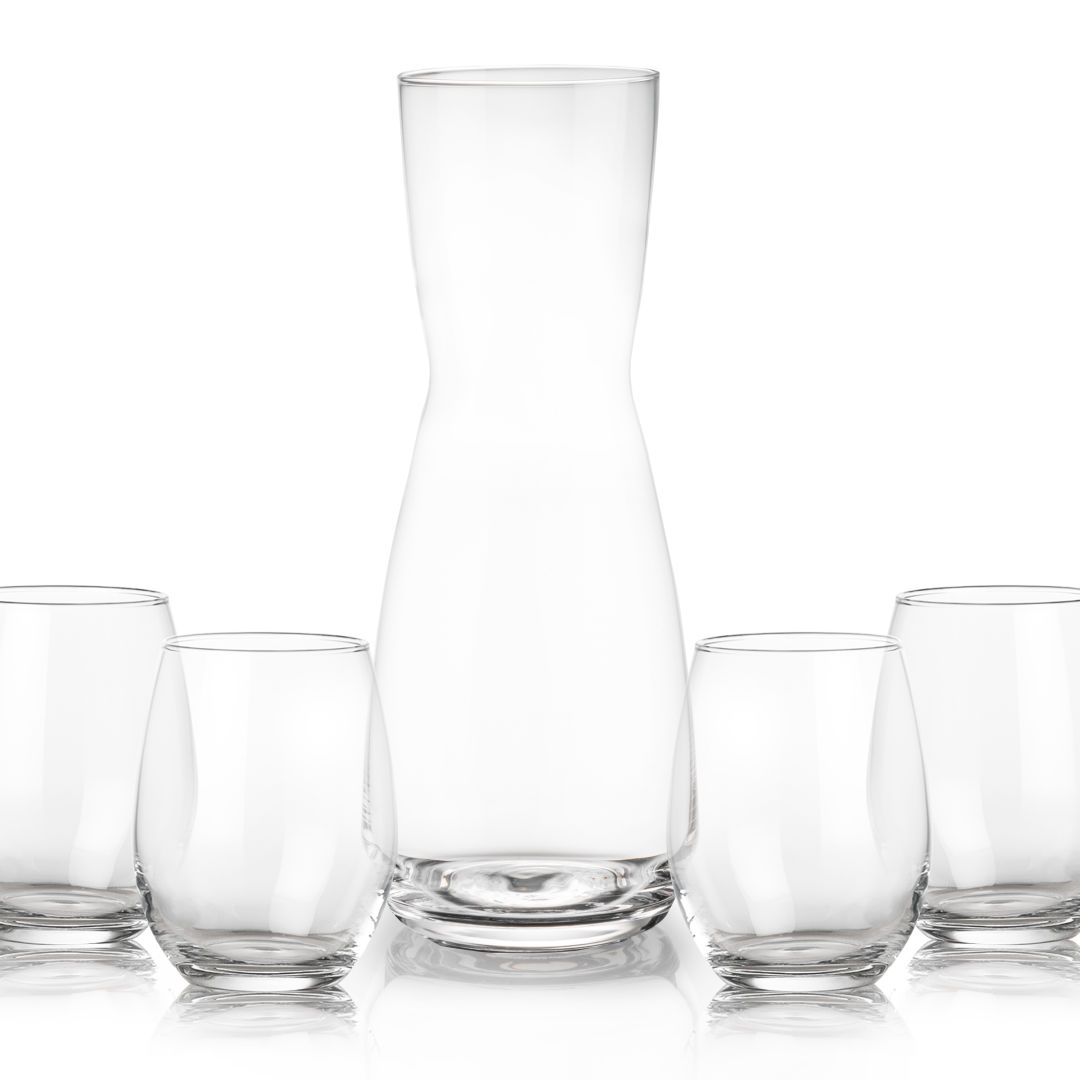 The Mason Carafe & Wine Glass Set pairs the elegant Mason Wine Carafe with two complementing stemless wine glasses, creating a refined presentation for any occasion. The carafe’s sleek curves and the glasses’ timeless design make this set ideal for sharing and savoring fine wines. Available with a variety of different wine glass styles.
