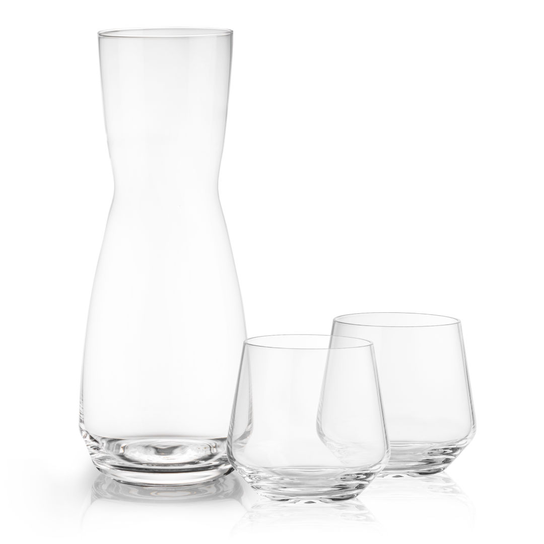 The Mason Carafe & Wine Glass Set pairs the elegant Mason Wine Carafe with two complementing stemless wine glasses, creating a refined presentation for any occasion. The carafe’s sleek curves and the glasses’ timeless design make this set ideal for sharing and savoring fine wines. Available with a variety of different wine glass styles.