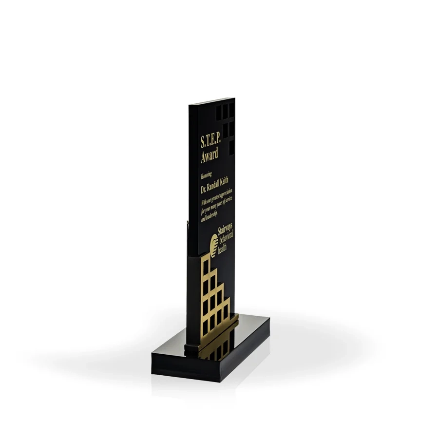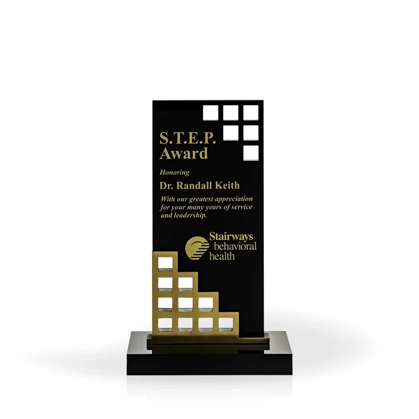 The Matrix Award Series is available in two sizes and with your choice of Gold or Silver as an accent. The most striking element of the Matrix Awards is the gold or silver metal grid panel that is embedded in the design. A striking black acrylic panel is cut with a grid pattern in the upper right corner, and the metal grid panel is placed in the opposite corner, acting as part of the base of the award. The contrast of metal and acrylic is unique and gives the award a contemporary look and feel. The acrylic panel is printed in contrasting color with recognition content and logos, and sits atop a solid, black acrylic base. 9″ H x 5.5″ W x 2.5″ D