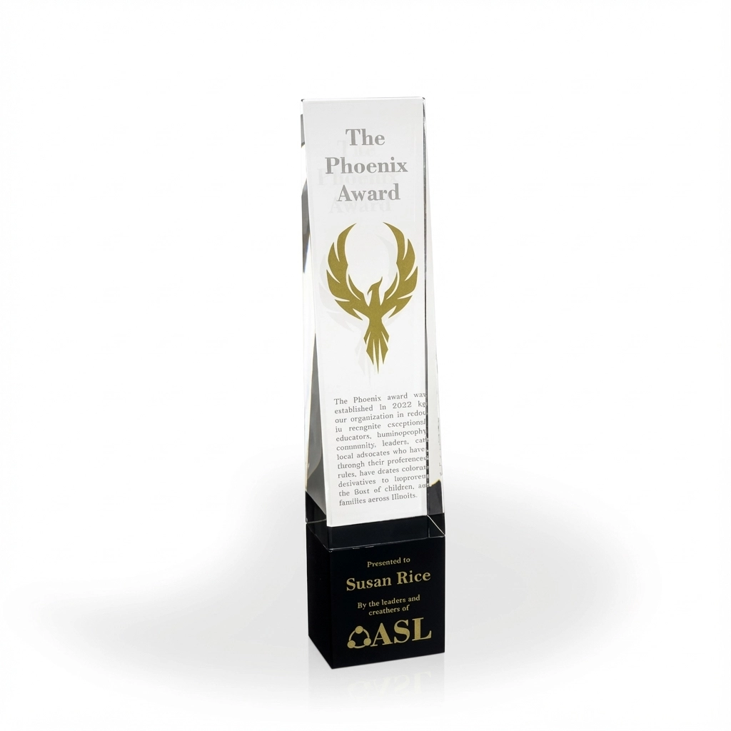 The impressive Matteo Crystal Award is the perfect option when you need to commemorate a person or achievement that are special to your organization. The flawless, clear optic crystal is cut with flat edges into a wedge shaped column, that tapers to a fine point. The crystal wedge is then affixed to a customized black base. 13″ H x 2.875″ W x 1.875″ D