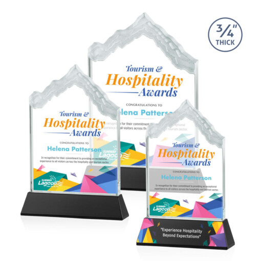 The highest mountain peak in North America, Mount McKinley is synonymous with the beauty and awe-inspiring natural wonder that is Alaska, the Last Frontier. Featuring 3/4″ thick Starfire Crystal, this stunning award is mounted on your choice of clear or colored thick Optical Crystal Newhaven Base. Memorialize your special achievement with a deep etched and frosted monument to one of North America’s most stunning peaks. Let your message POP! with full-color VividPrint™. Second position imprint on base optional. 5.0″ W x 7.5″ H x 2.0″ D