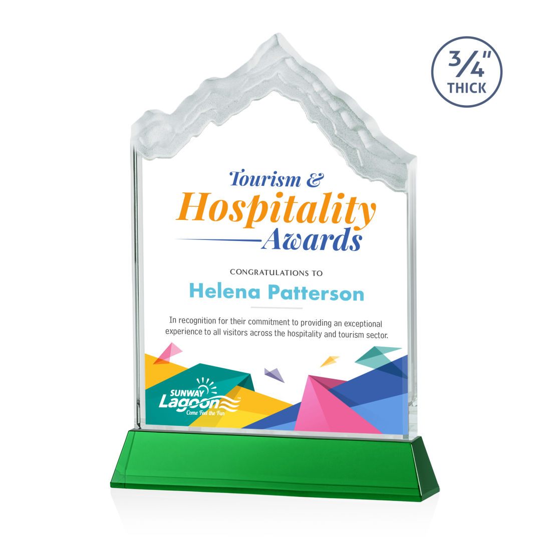 The highest mountain peak in North America, Mount McKinley is synonymous with the beauty and awe-inspiring natural wonder that is Alaska, the Last Frontier. Featuring 3/4″ thick Starfire Crystal, this stunning award is mounted on your choice of clear or colored thick Optical Crystal Newhaven Base. Memorialize your special achievement with a deep etched and frosted monument to one of North America’s most stunning peaks. Let your message POP! with full-color VividPrint™. Second position imprint on base optional. 5.0″ W x 7.5″ H x 2.0″ D