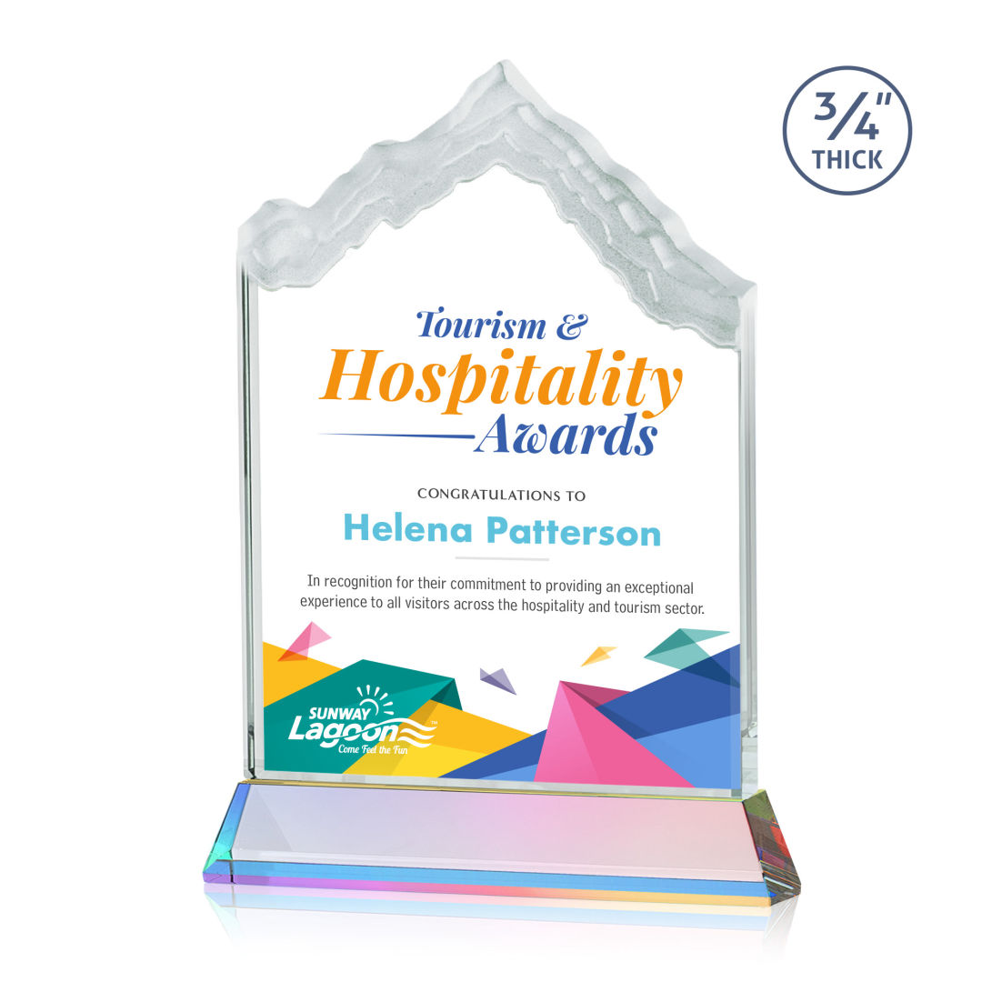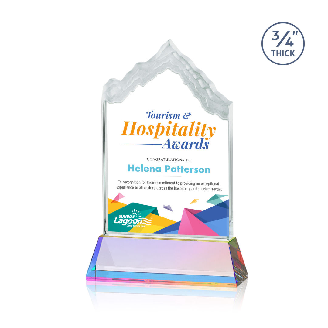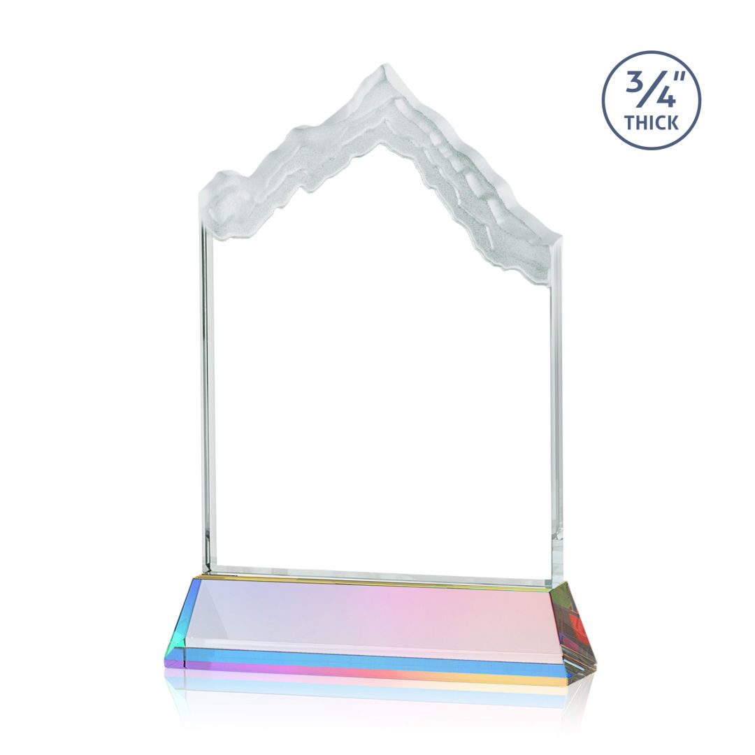 The highest mountain peak in North America, Mount McKinley is synonymous with the beauty and awe-inspiring natural wonder that is Alaska, the Last Frontier. Featuring 3/4″ thick Starfire Crystal, this stunning award is mounted on your choice of clear or colored thick Optical Crystal Newhaven Base. Memorialize your special achievement with a deep etched and frosted monument to one of North America’s most stunning peaks. Let your message POP! with full-color VividPrint™. Second position imprint on base optional. 5.0″ W x 7.5″ H x 2.0″ D