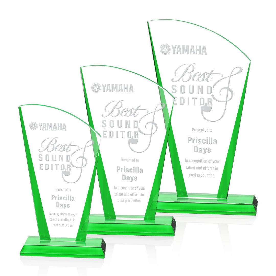 The Starfire Crystal Merivale Award features a graceful curved top with a bold peak on the left side, creating a dynamic and modern silhouette. Accented with colored tapered edges and matching base, it offers a striking pop of color to highlight any achievement. Available in gold, sapphire, emerald, or ruby. 4.375″ W x 7.5″ H x 2.0″ D