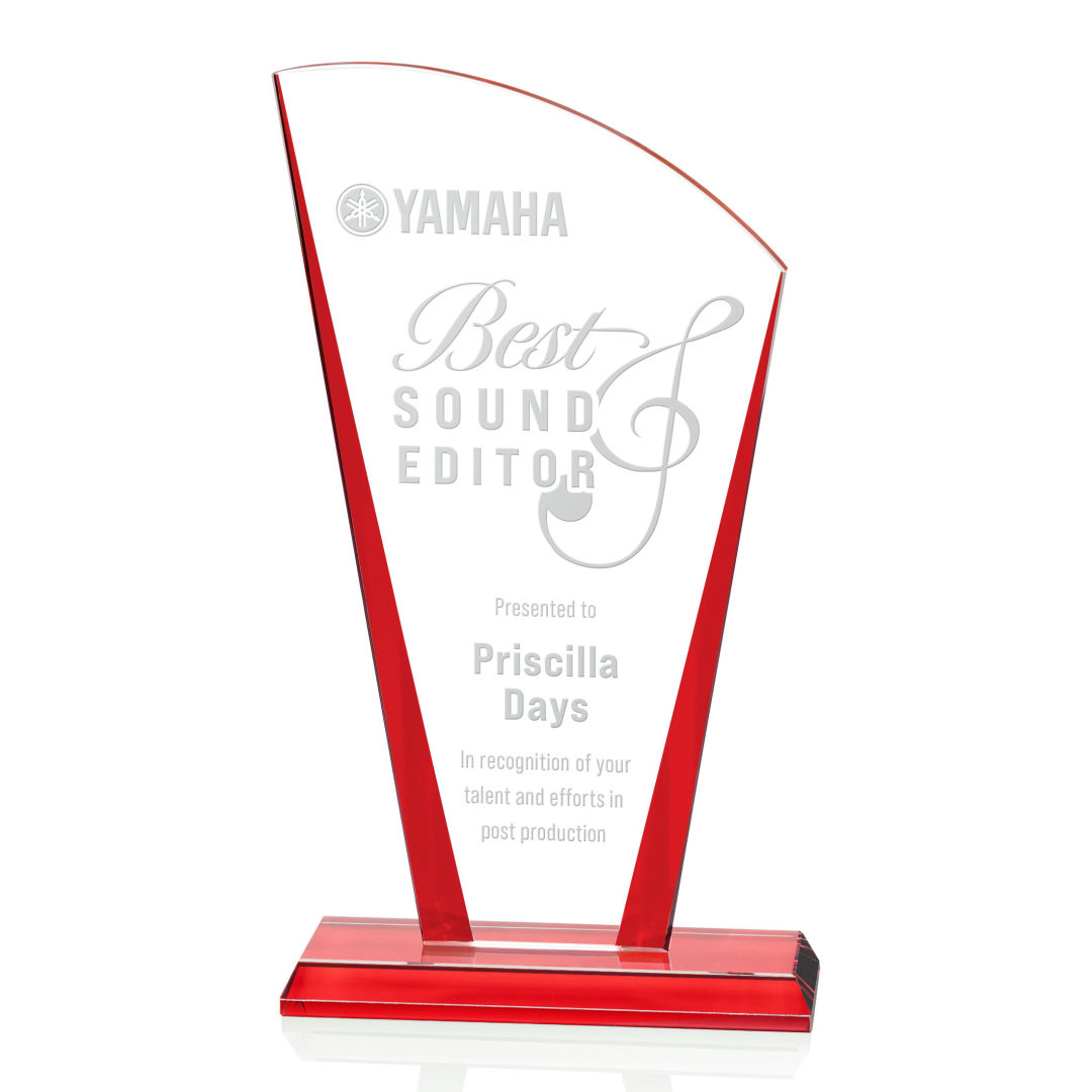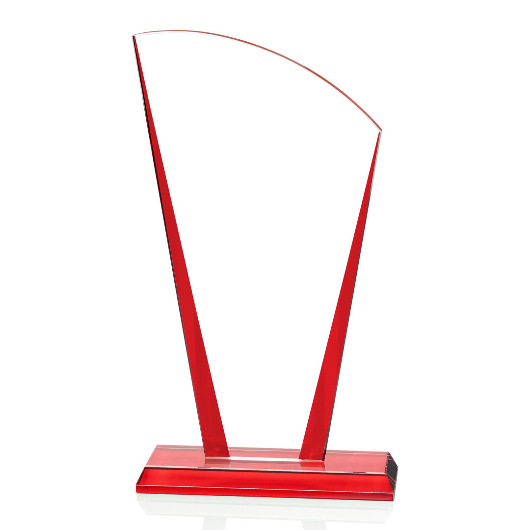 The Starfire Crystal Merivale Award features a graceful curved top with a bold peak on the left side, creating a dynamic and modern silhouette. Accented with colored tapered edges and matching base, it offers a striking pop of color to highlight any achievement. Available in gold, sapphire, emerald, or ruby. 4.375″ W x 7.5″ H x 2.0″ D