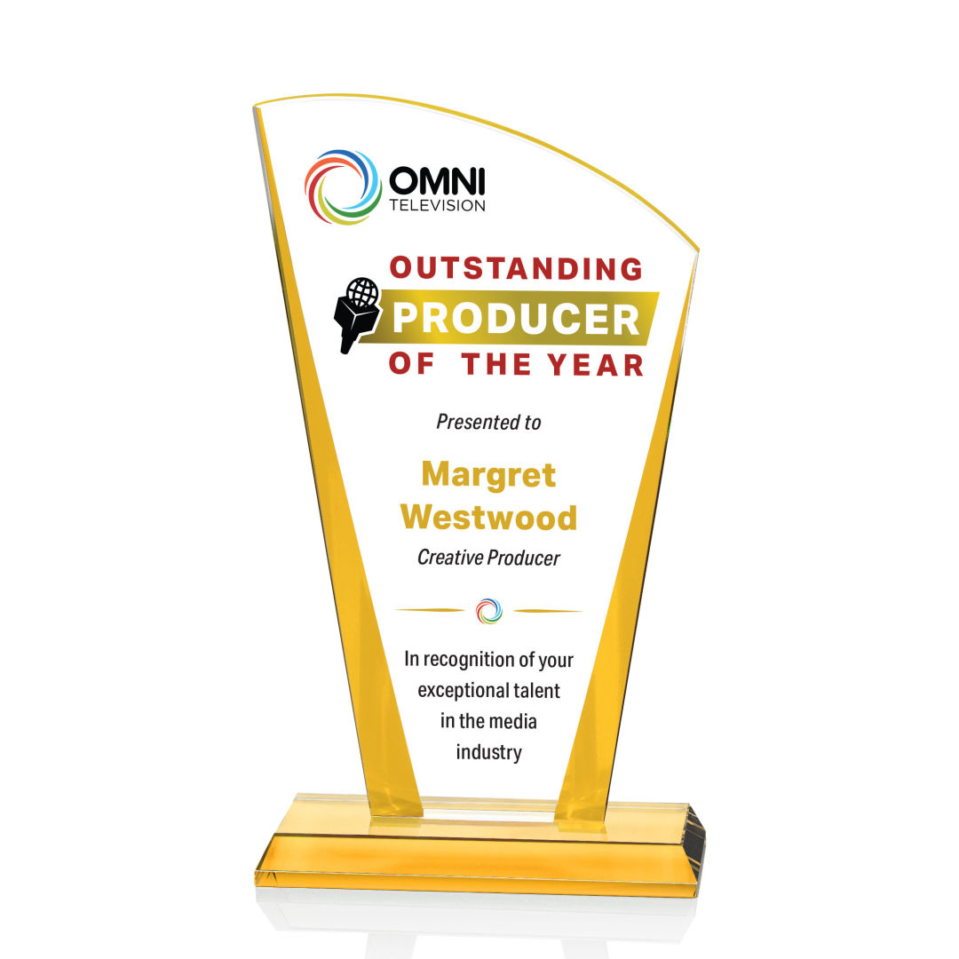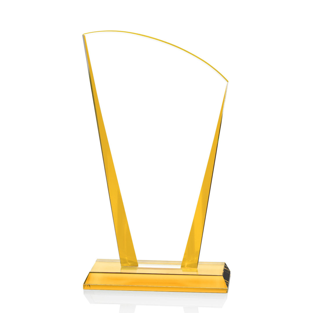 The Starfire Crystal Merivale VividPrint™ Award features a graceful curved top with a bold peak on the left side, creating a dynamic and modern silhouette. Accented with colored tapered edges and matching base, it offers a striking pop of color to highlight any achievement. Available in gold, sapphire, emerald, or ruby. Take your artwork to the next level with full-color VividPrint™! 4.375″ W x 7.5″ H x 2.0″ D