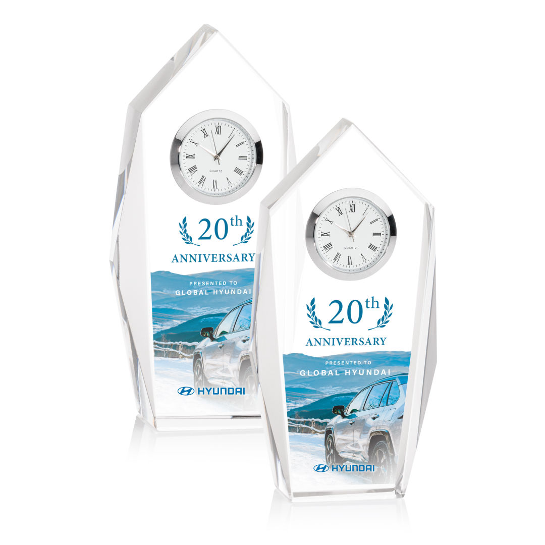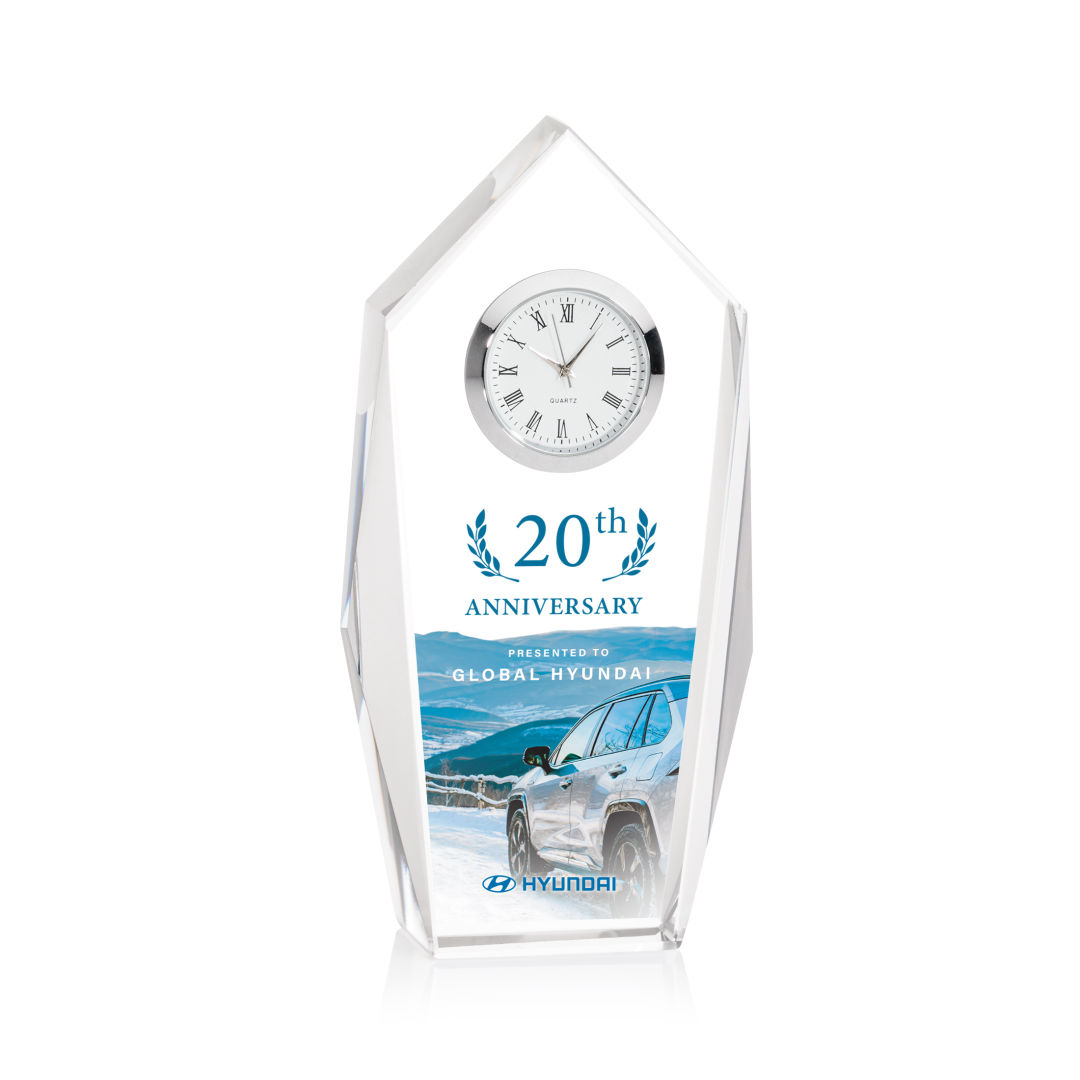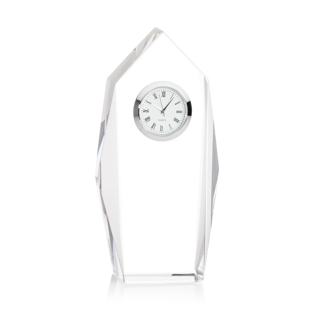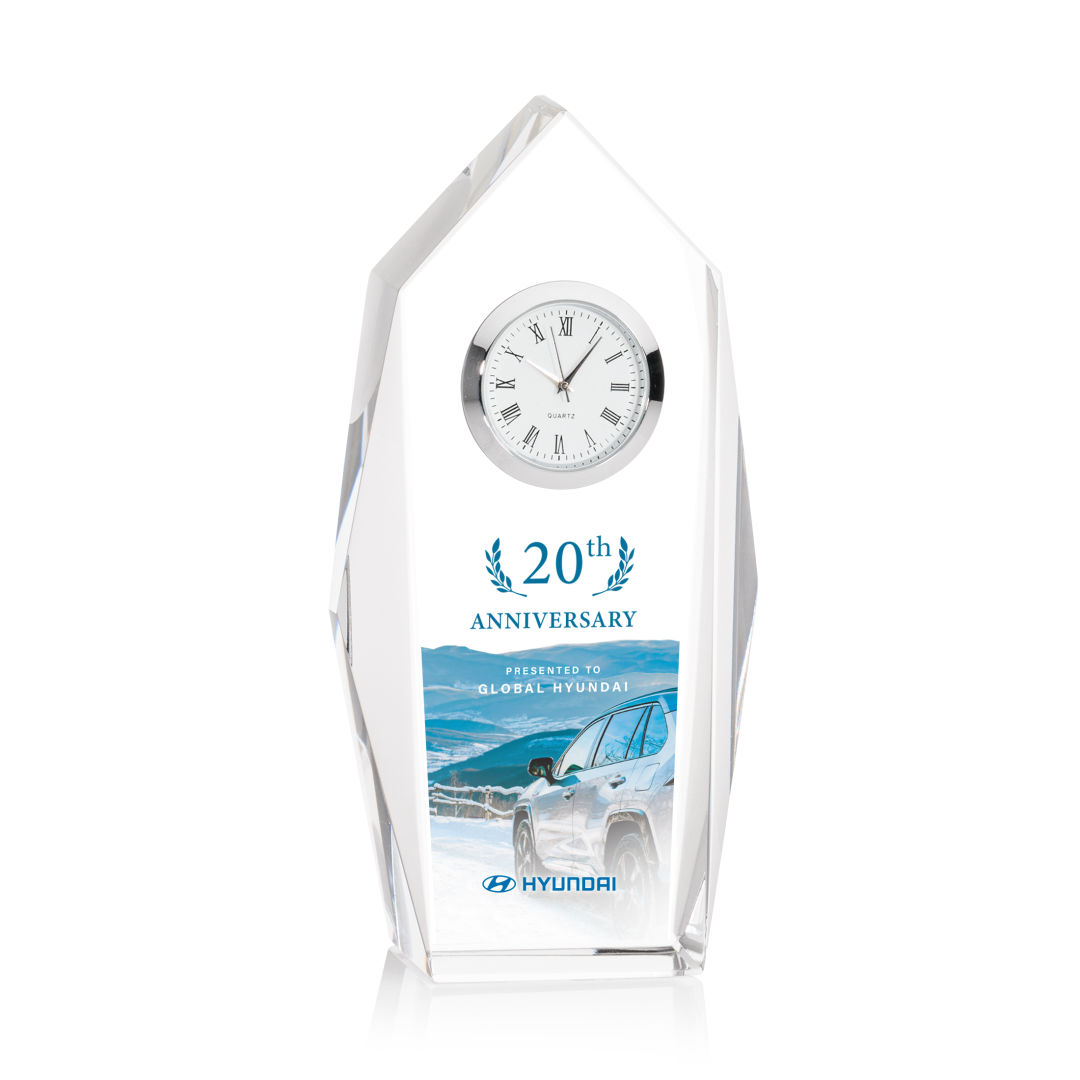 The thick optical crystal of the Mesa VividPrint™ Clock s side beveled to embellish the elegant peak with a classic white faced Roman numeral dial, making it the perfect timepiece for any desk or shelf. Let your message POP! with full-color VividPrint™. 3.0″ W x 5.75″ H x 1.0″ D