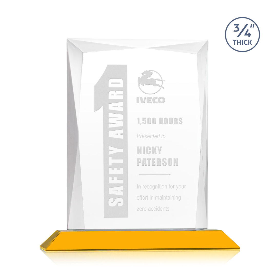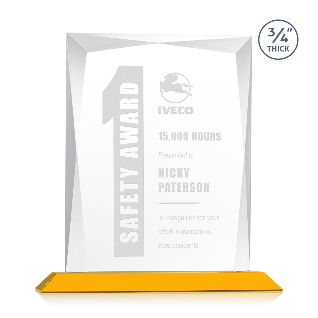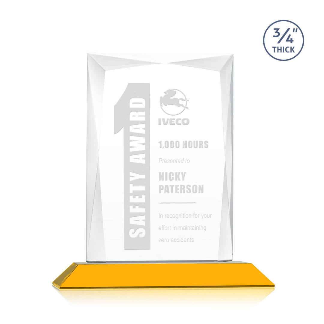 A staple of the recognition industry, the Messina is a striking award in thick 3/4″ Starfire Crystal mounted on clear or colored base. Featuring brilliant interchanging bevels that create a beautiful frame of refracting light for your special achievement. 6.0″ W x 6.75″ H x 3.0″ D