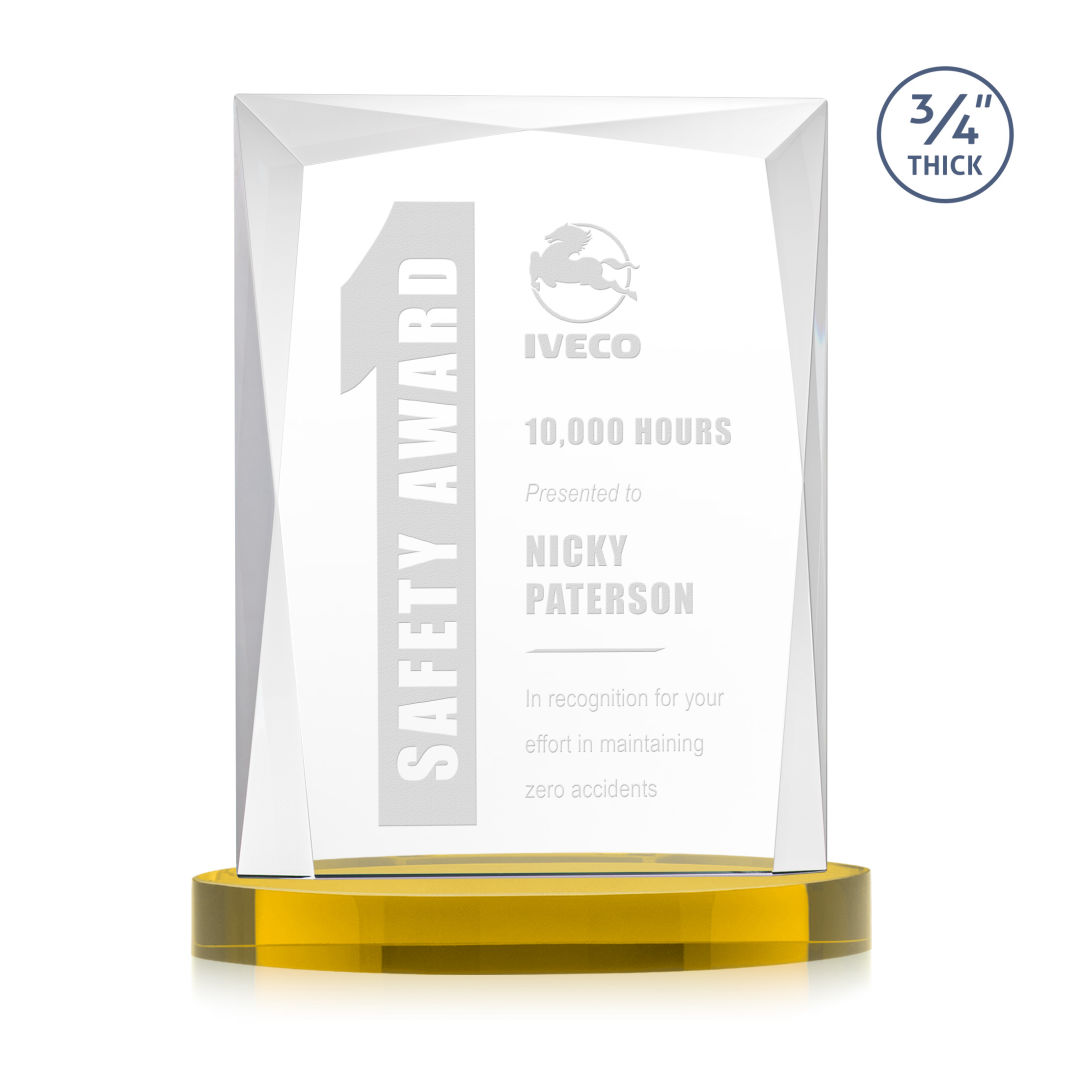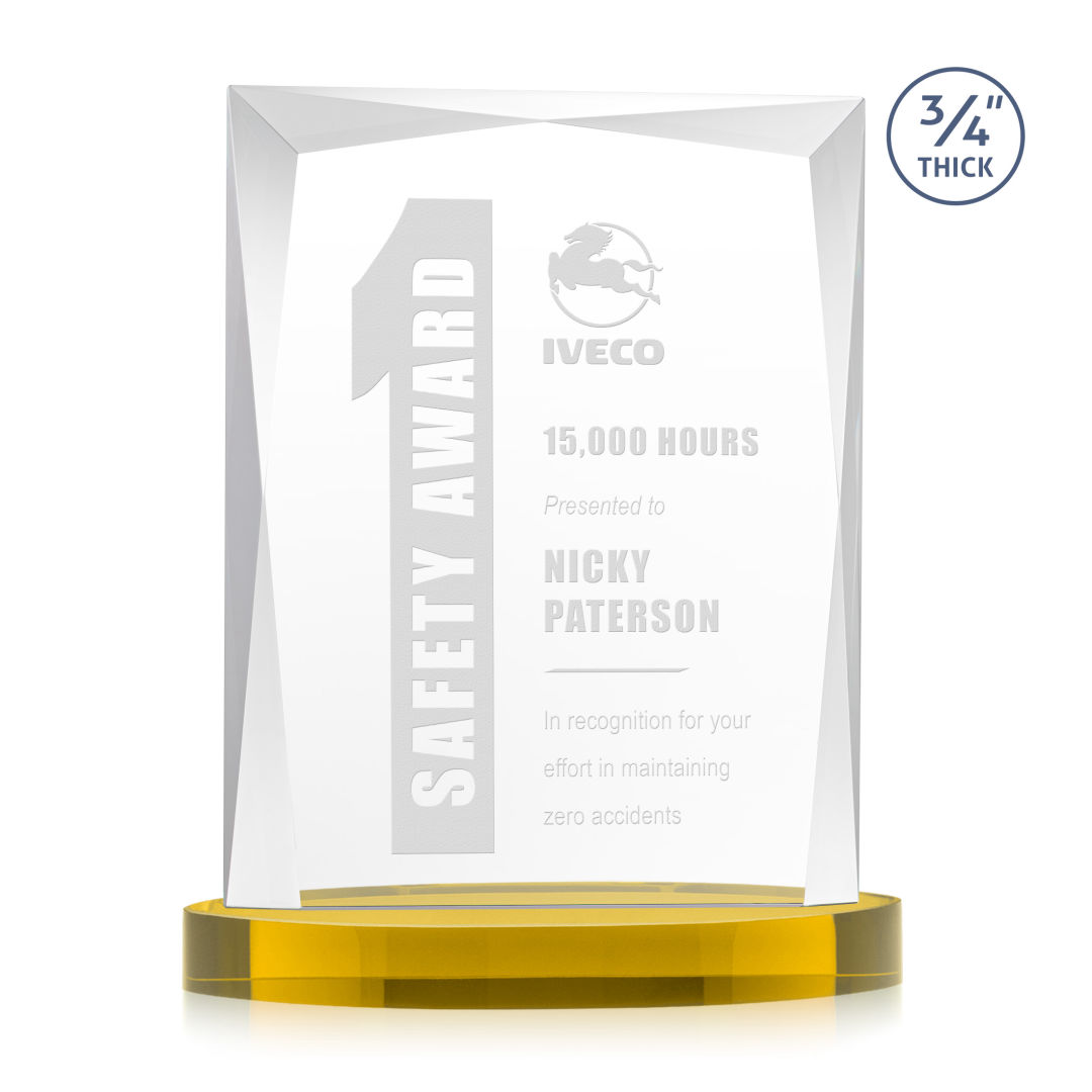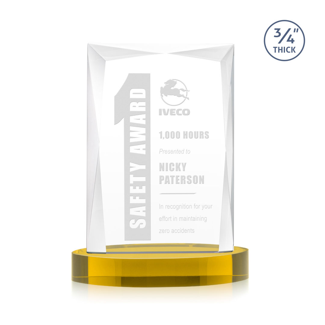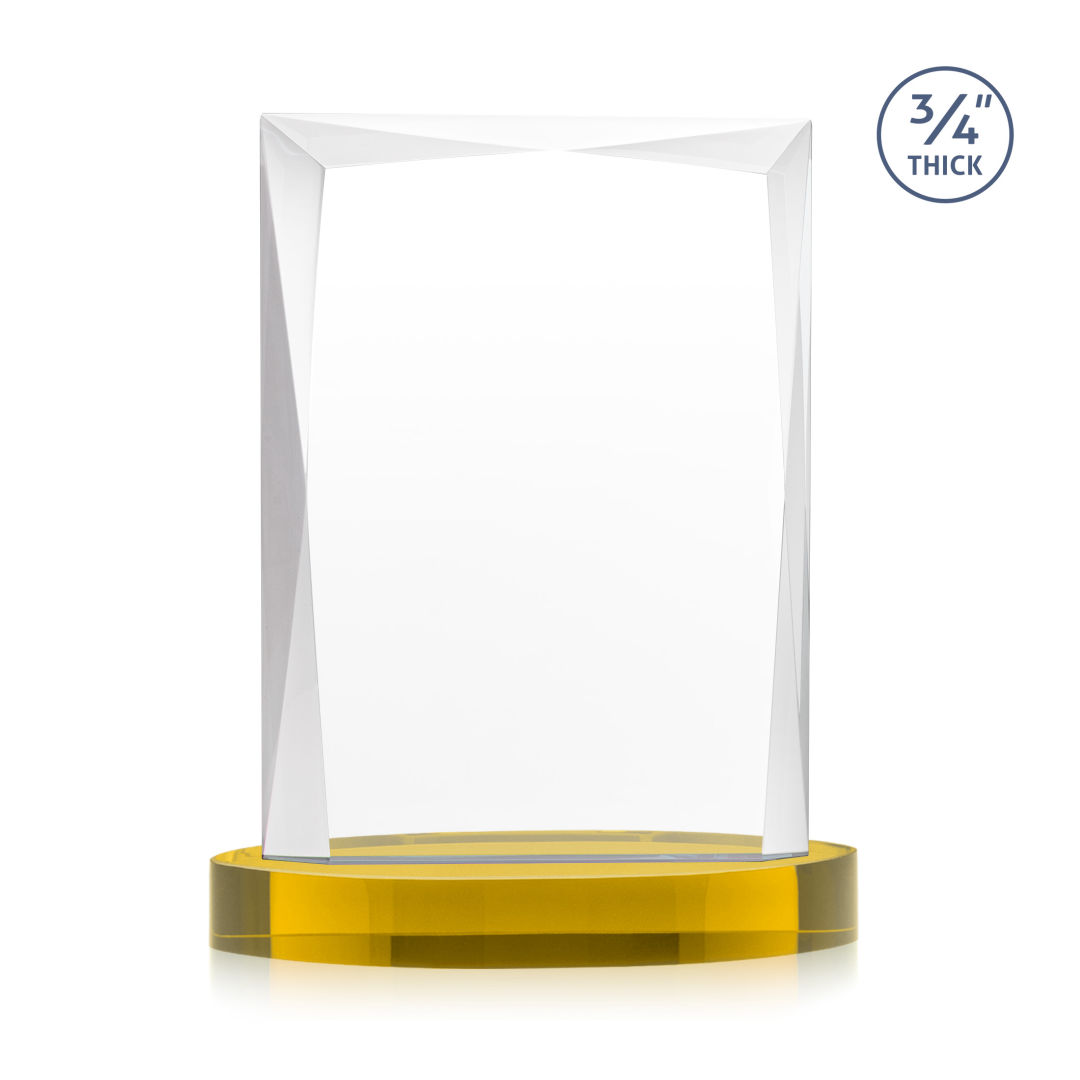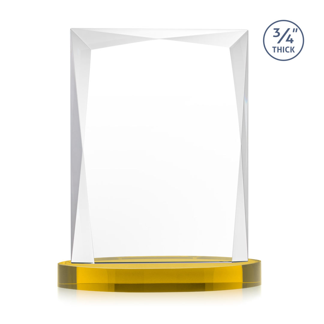 A staple of the recognition industry, the Messina on Alberton Base is a striking award in thick 3/4″ Starfire Crystal. Featuring brilliant interchanging bevels that create a beautiful frame of refracting light for your special achievement. 5.0″ W x 7.0″ H x 2.75″ D