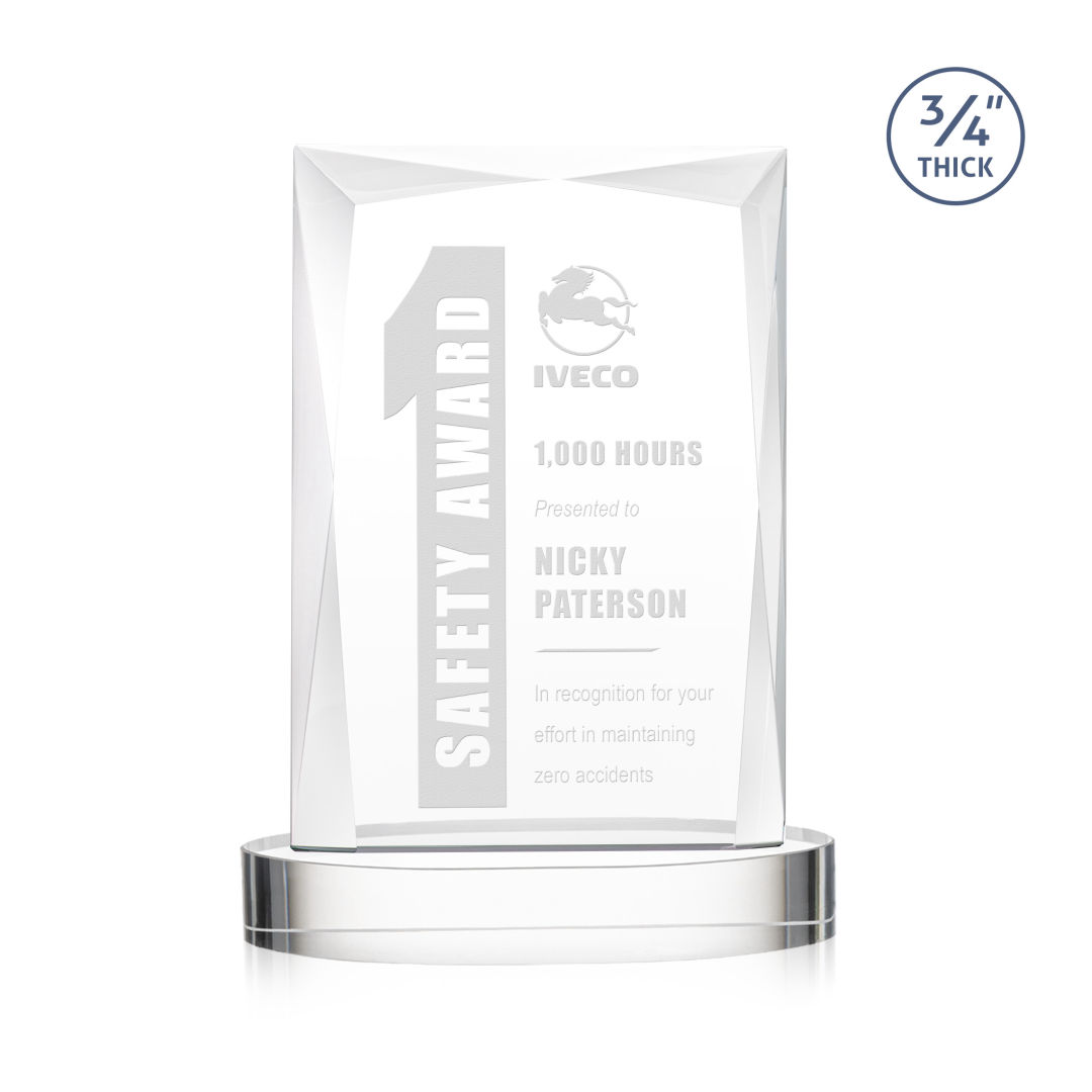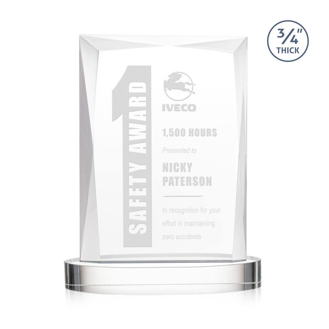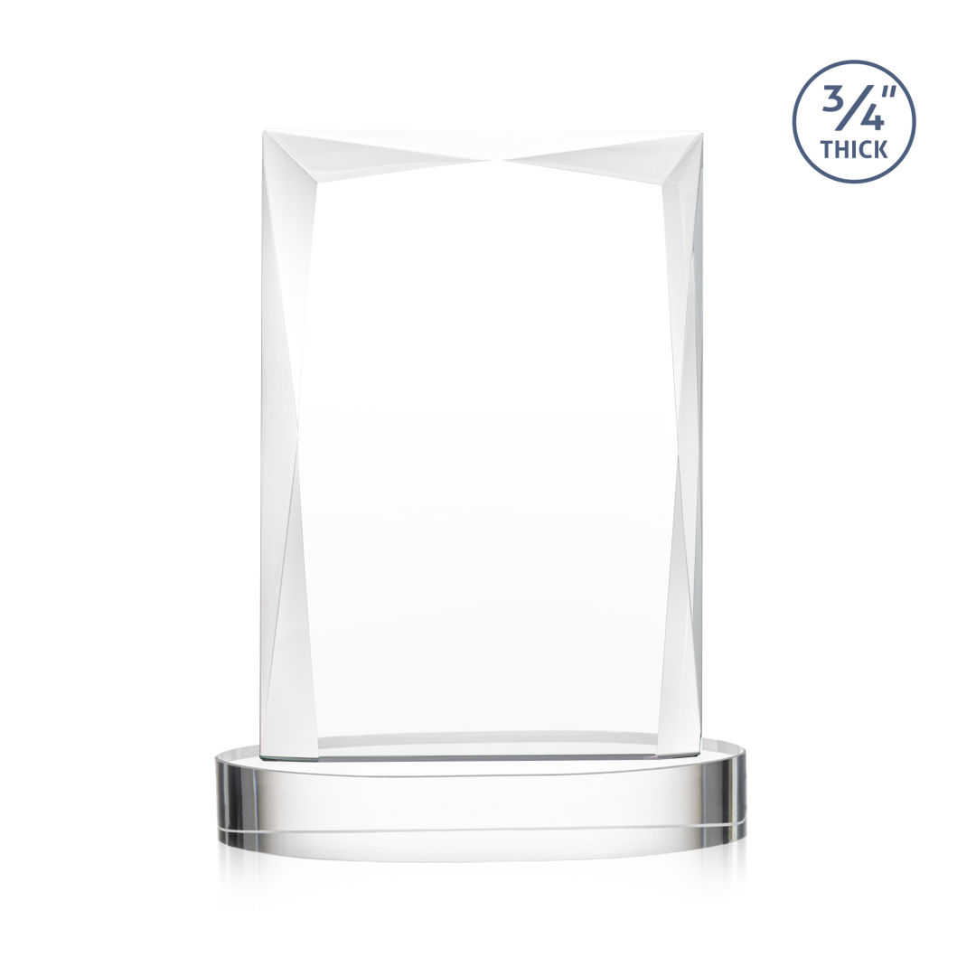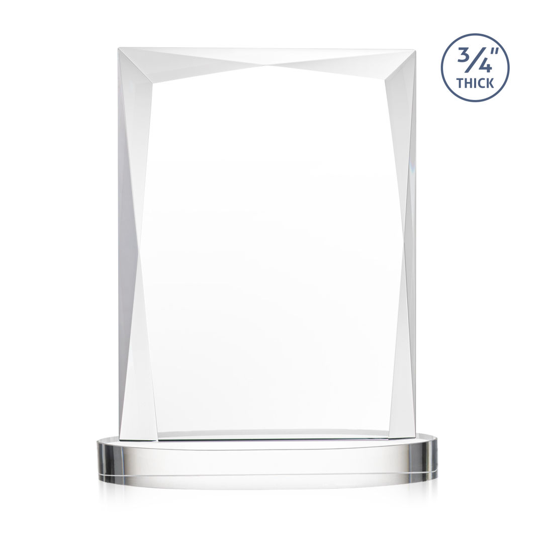 A staple of the recognition industry, the Messina on Alberton Base is a striking award in thick 3/4″ Starfire Crystal. Featuring brilliant interchanging bevels that create a beautiful frame of refracting light for your special achievement. 5.0″ W x 7.0″ H x 2.75″ D