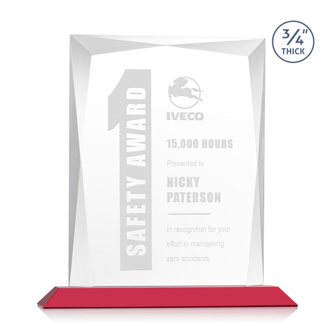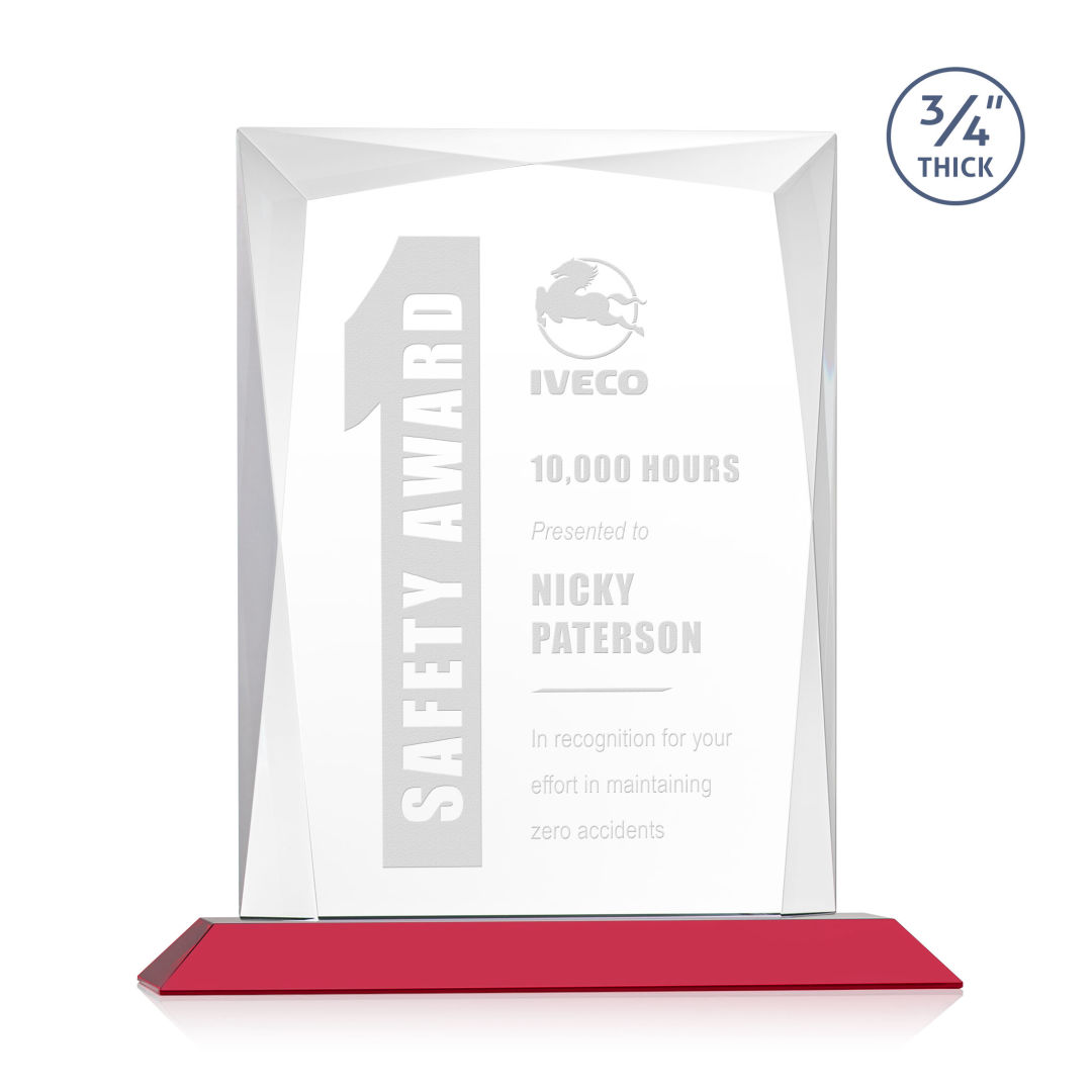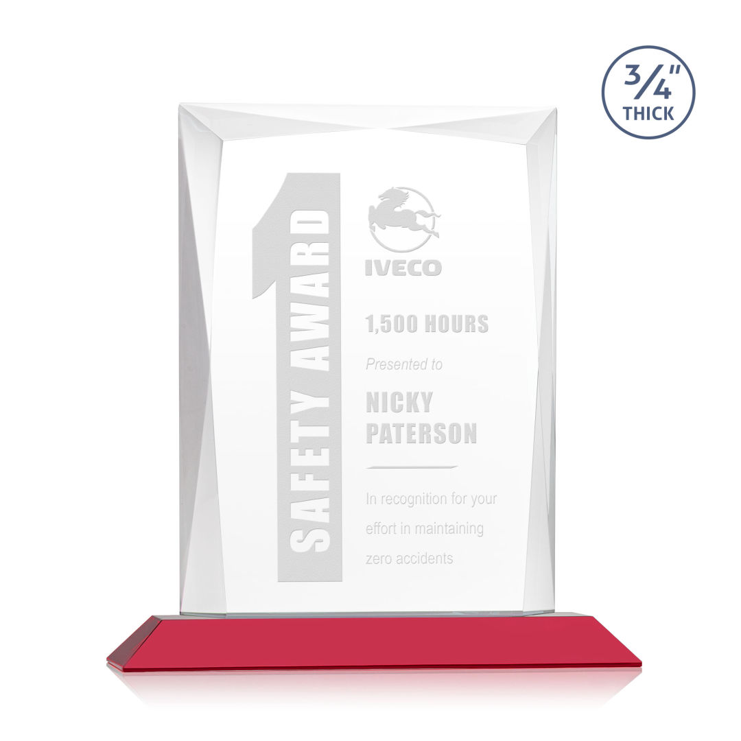 A staple of the recognition industry, the Messina is a striking award in thick 3/4″ Starfire Crystal mounted on clear or colored base. Featuring brilliant interchanging bevels that create a beautiful frame of refracting light for your special achievement. 6.0″ W x 6.75″ H x 3.0″ D