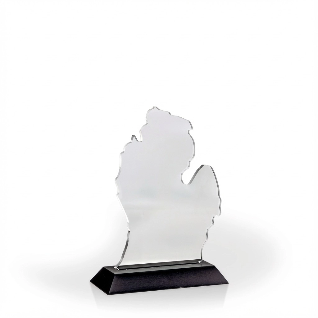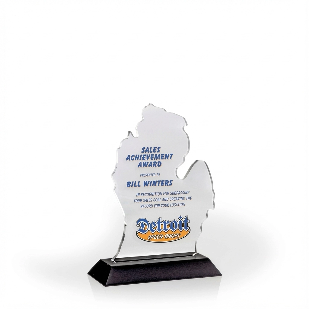 An attractive and affordable award option, our acrylic cutout awards are made in the USA with 1/4″ clear acrylic and a black, beveled wood base. These budget-friendly awards require minor assembly. The acrylic pop-in and wood base are packaged together, un-attached, in a slim-line white tri-fold box. 7″ H x 4.75″ W x 2″ D