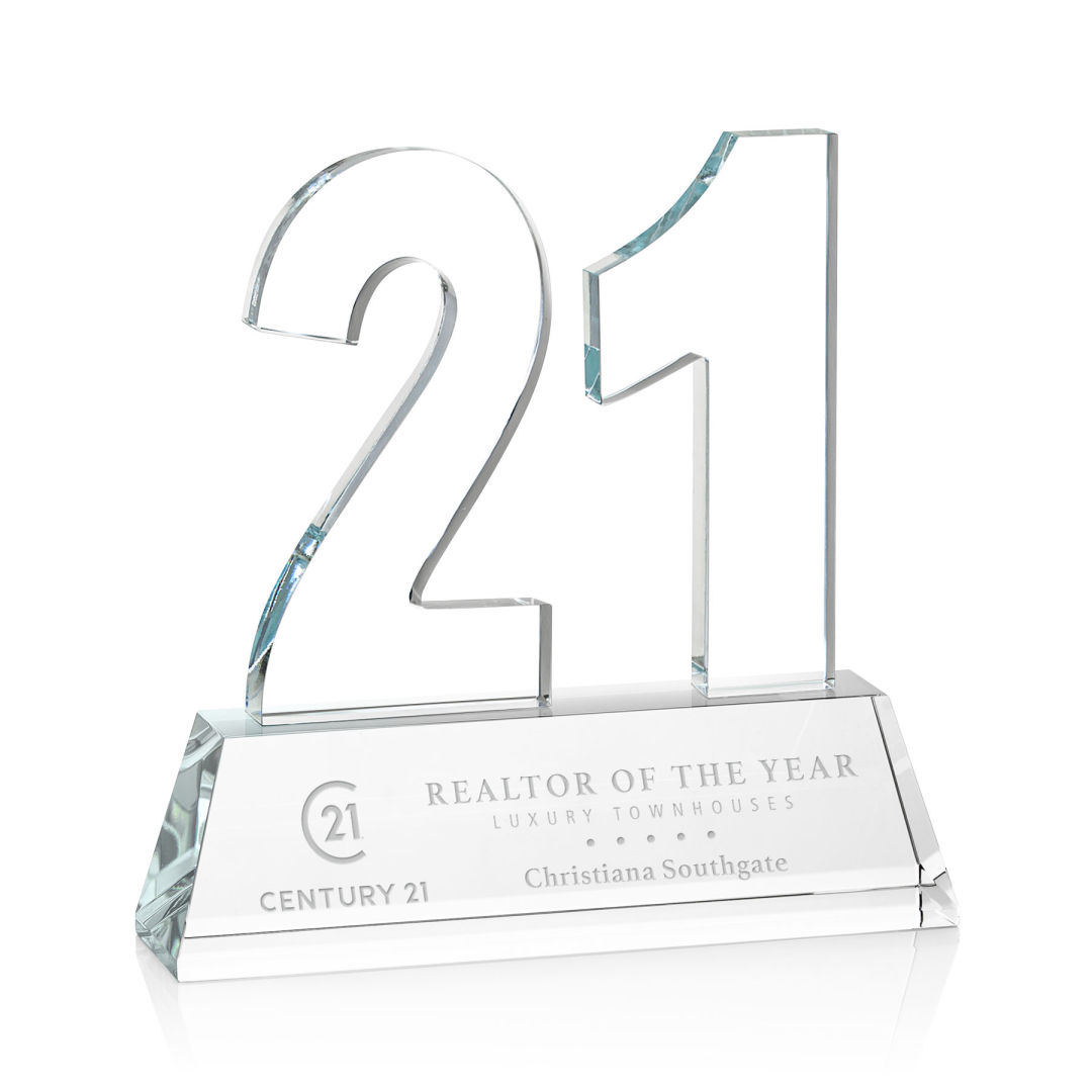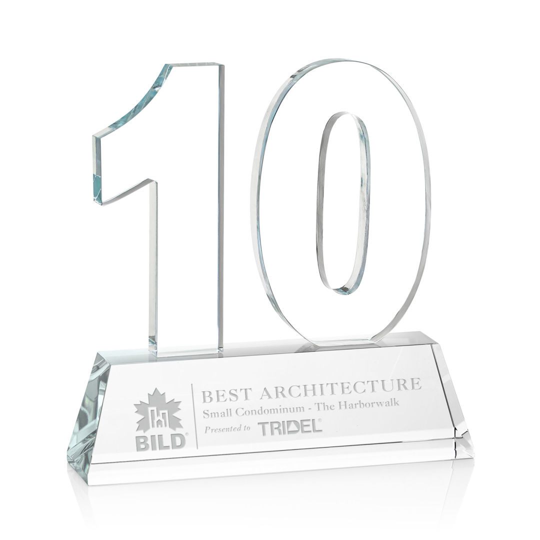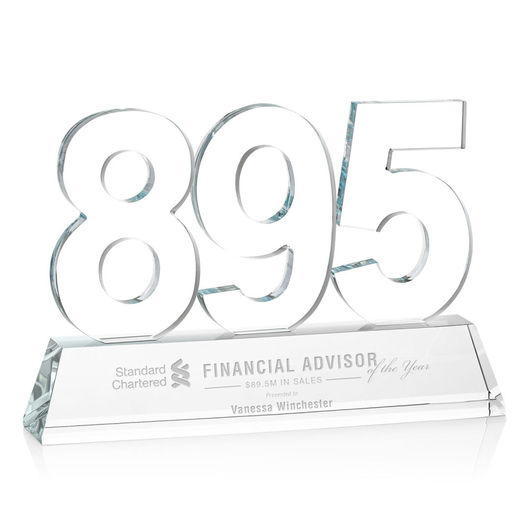 Recognize a monumental achievement with our exquisite Optical Crystal Milestone award. These impressive awards are perfect for recognizing a personal or corporate achievement or a landmark event. A great way to honor a significant moment. Available with single, double or triple digits, these awards can recognize Milestones #0-999. Available with Deep Etching or full-color VividPrint™. Second, Third, and Fourth position deep etch on numbers is optional. 5.0″ W x 8.5″ H x 1.5″ D