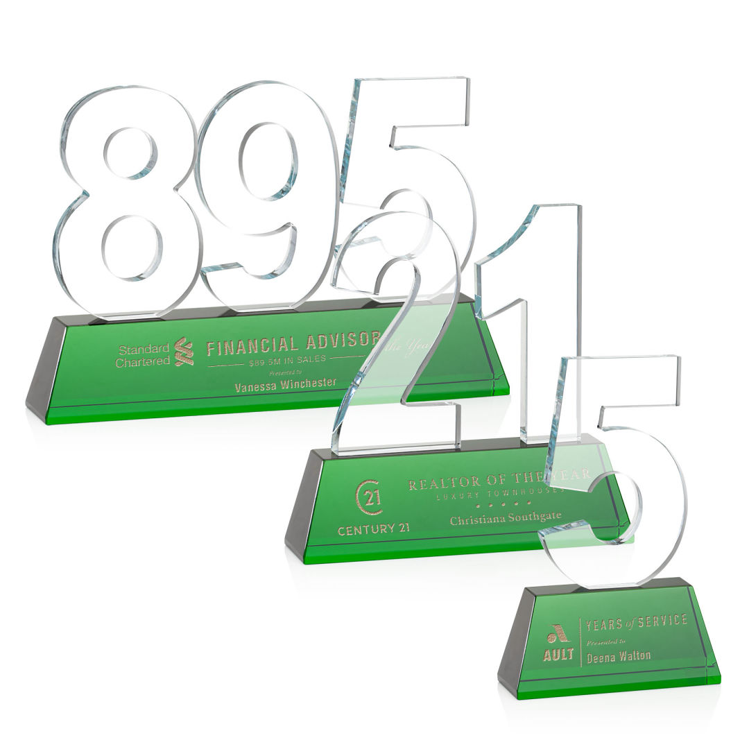 Recognize a monumental achievement with our exquisite Optical Crystal Milestone award. These impressive awards are perfect for recognizing a personal or corporate achievement or a landmark event. A great way to honor a significant moment. Available with single, double or triple digits, these awards can recognize Milestones #0-999. Available with Deep Etching or full-color VividPrintâ„¢. Second, Third, and Fourth position deep etch on numbers is optional. 5.0″ W x 8.5″ H x 1.5″ D