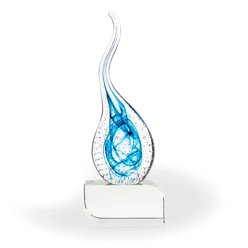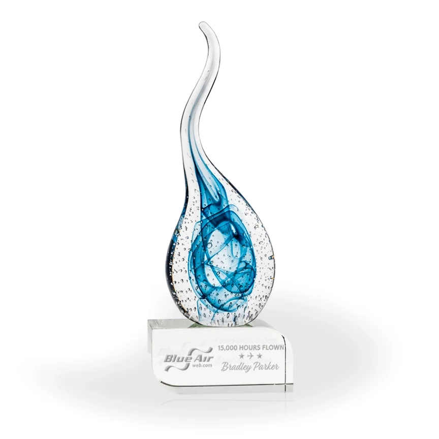 The Milton Art Glass Award is a gorgeous addition to any awards program. This award is hand-blown with shades of blue and clear bubbles on the inside of the flame, and sits atop a clear crystal base. Art glass awards are hand blown, and each piece will be slightly different in color, shape, and size. Bubbles and swirls are a part of the process and are considered normal and acceptable. 14.25″ H x 6″ W x 3″ D