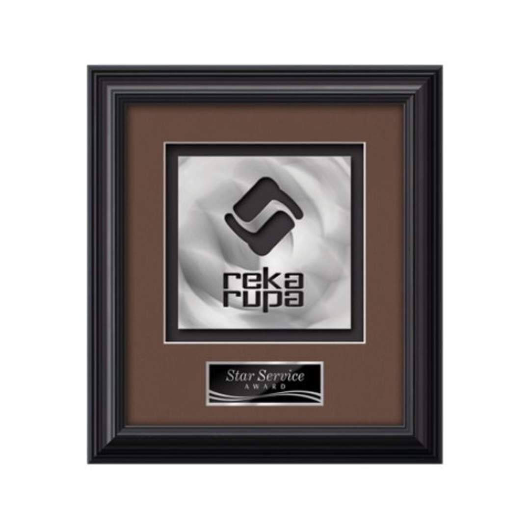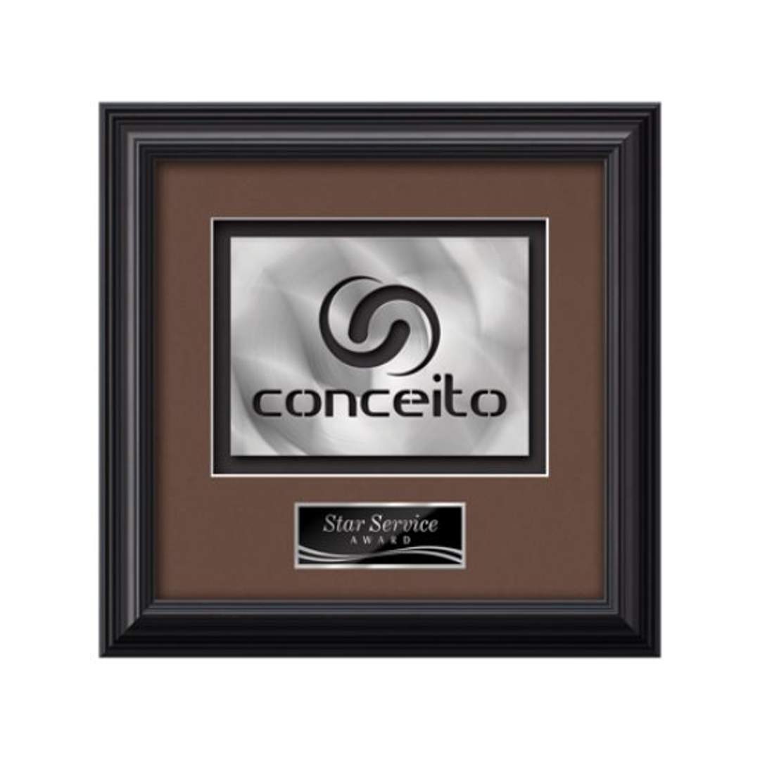 Elevate your brand to a gallery quality work of art with our proprietary AquaShaping™ process. Using a block of solid brushed aluminum, our technology cuts a dramatic contemporary rendition of your logo from solid metal. The dimensional sculpture is mounted in our Monarch presentation frame and paried with your choice of 2 standard mattes and a personalization plate. 11.25″ W x 11.25″ H
