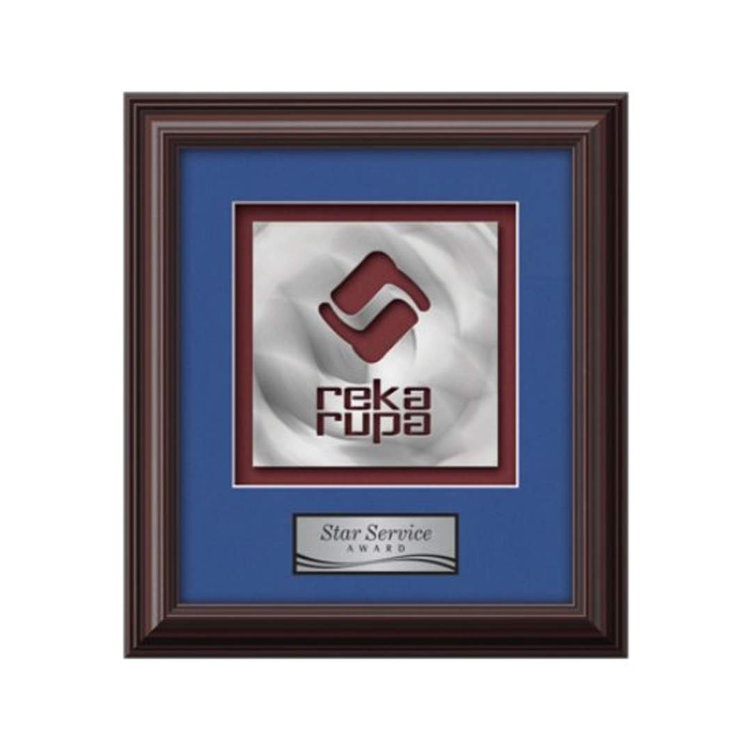 Elevate your brand to a gallery quality work of art with our proprietary AquaShapingâ„¢ process. Using a block of solid brushed aluminum, our technology cuts a dramatic contemporary rendition of your logo from solid metal. The dimensional sculpture is mounted in our Monarch presentation frame and paried with your choice of 2 standard mattes and a personalization plate. 11.25″ W x 11.25″ H