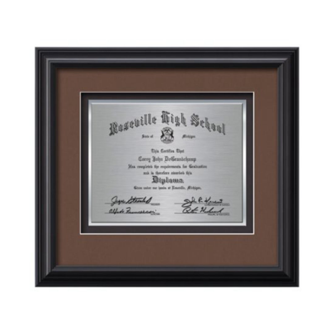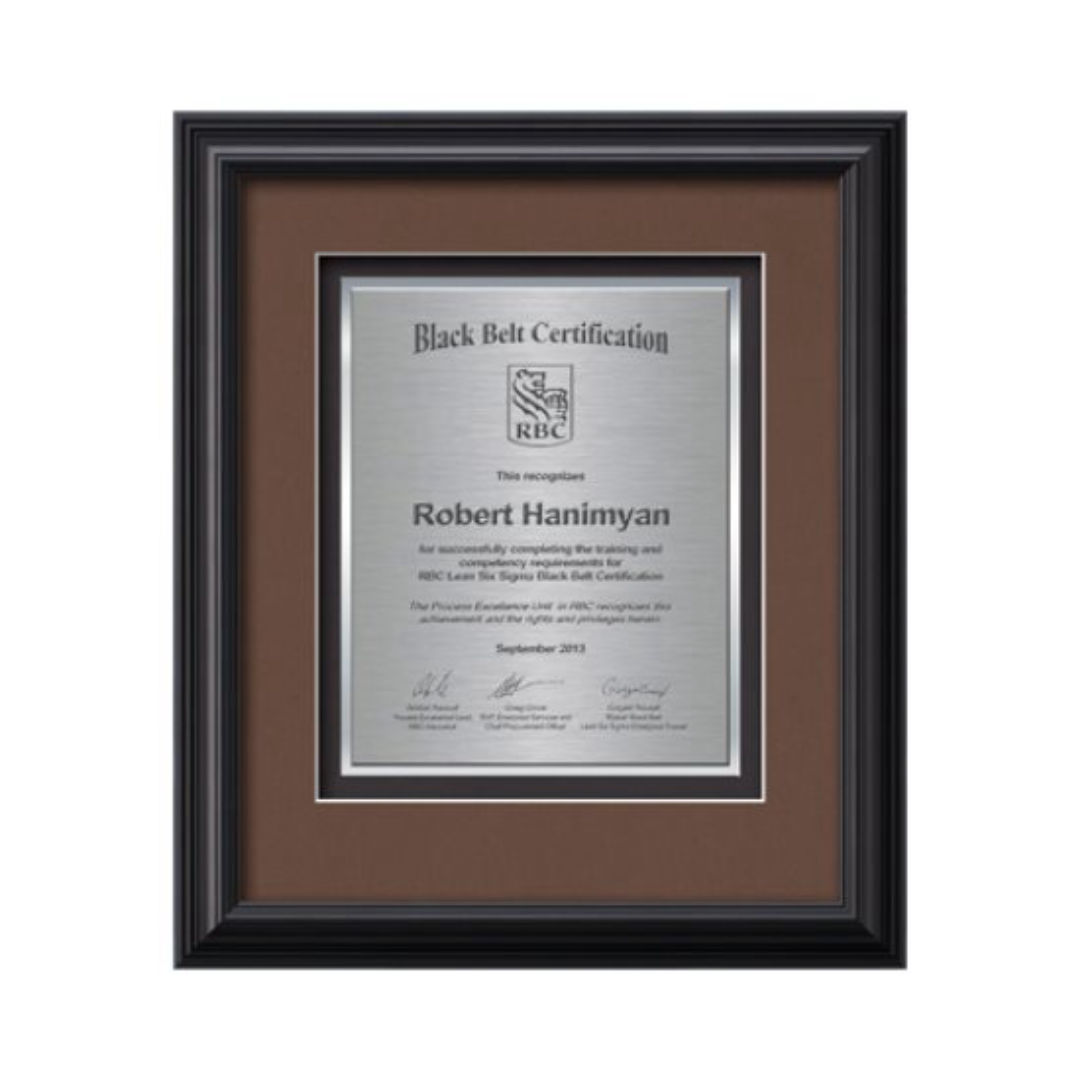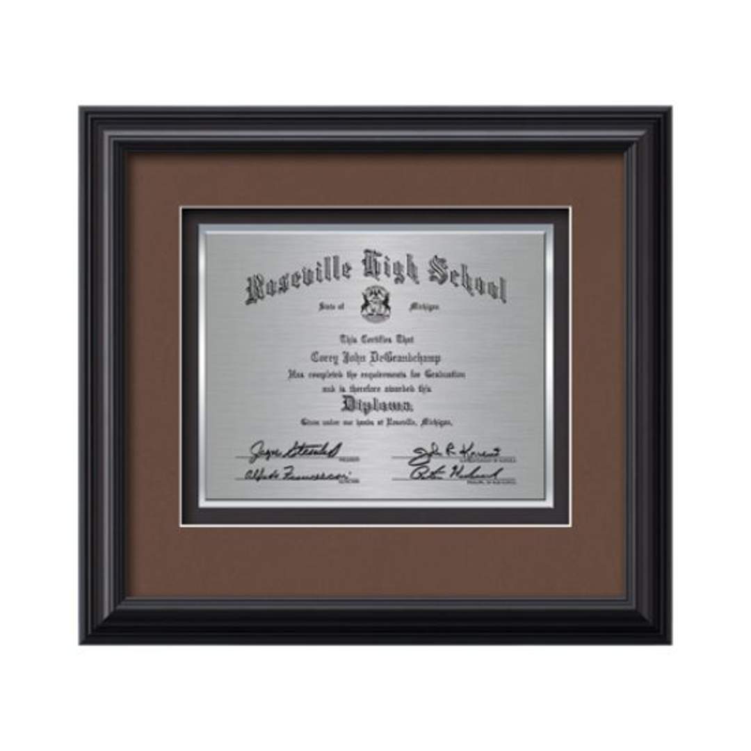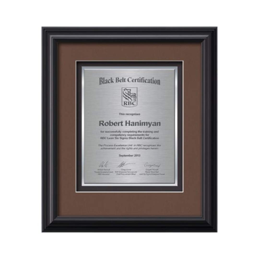 Commemorate a milestone achievement with Waterleaf Studios’ Certificate collection. Honor years of service, display diplomas, service awards, company mission statements, mergers & acquisitions or extraordinary achievements with these impressive statements of accomplishment. Your words of recognition are reproduced using our polished edged Double Plated TexEtch process with your choice of 2 standard mattes and framed in our museum quality Monarch molding. 15.75″ W x 14.25″ H