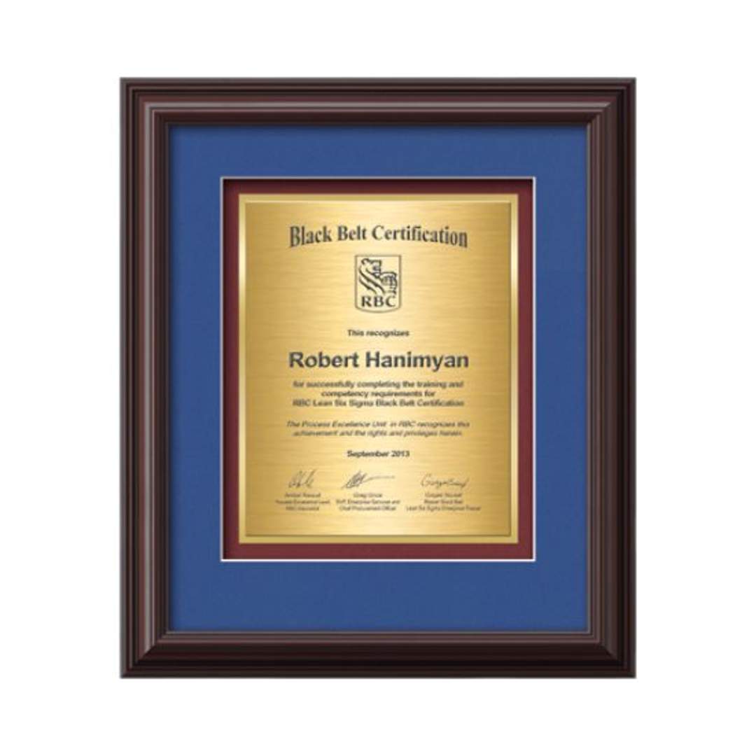 Commemorate a milestone achievement with Waterleaf Studios’ Certificate collection. Honor years of service, display diplomas, service awards, company mission statements, mergers & acquisitions or extraordinary achievements with these impressive statements of accomplishment. Your words of recognition are reproduced using our polished edged Double Plated TexEtch process with your choice of 2 standard mattes and framed in our museum quality Monarch molding. 15.75″ W x 14.25″ H