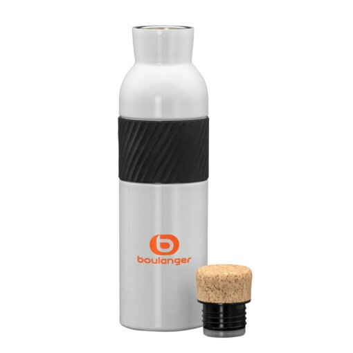 Double wall stainless steel bottle- Twist cap features a cork finish pattern- Ergonomic rubber comfort grip – Tapered wide mouth and lip for easy drinking. 2.75″ W x 10.0″ H