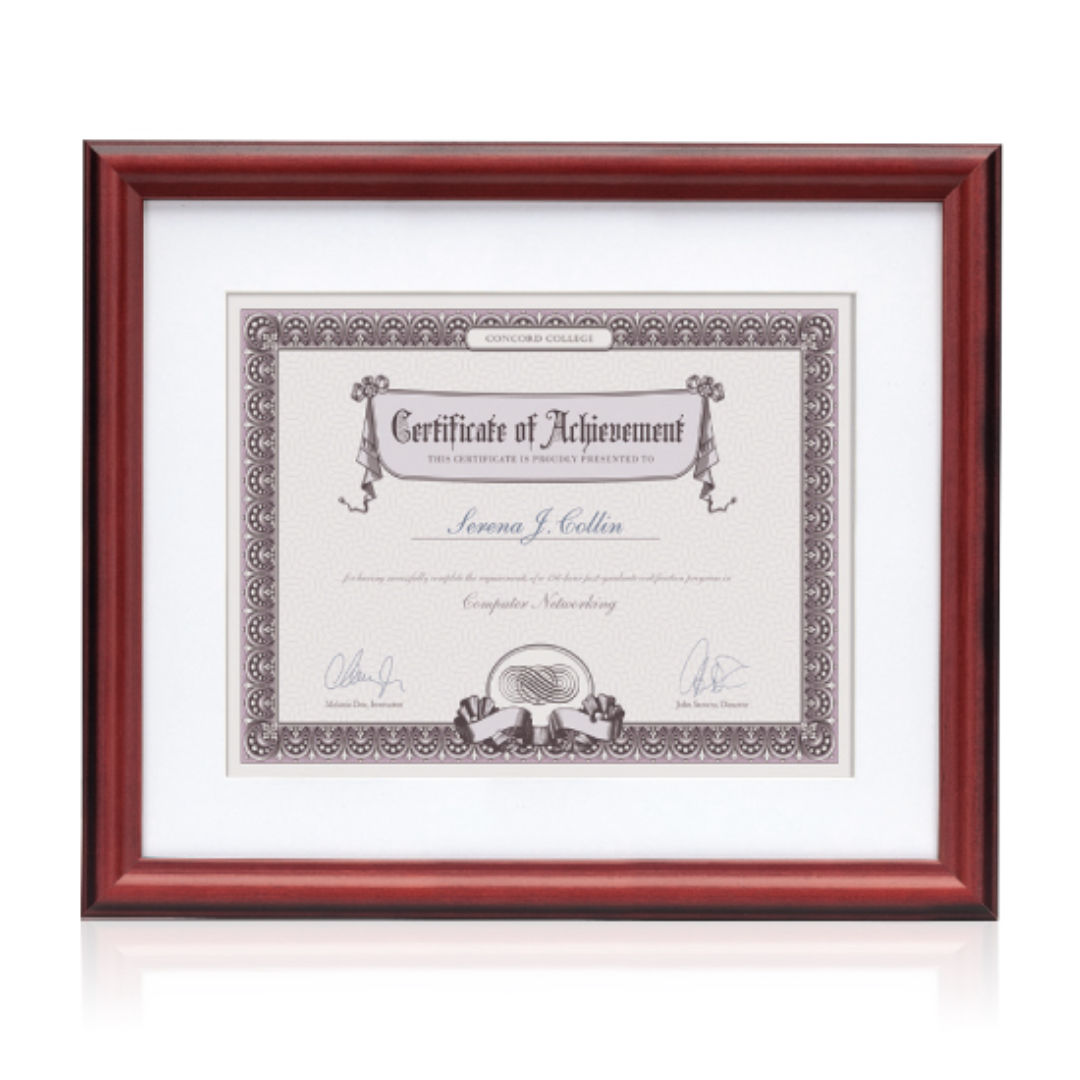 The elegant Montgomery wood certificate frame combines a thick white matte with mahogany finished cavetto curves to create this stately display for your symbol of accomplishment. 8.5″ W x 11.0″ H