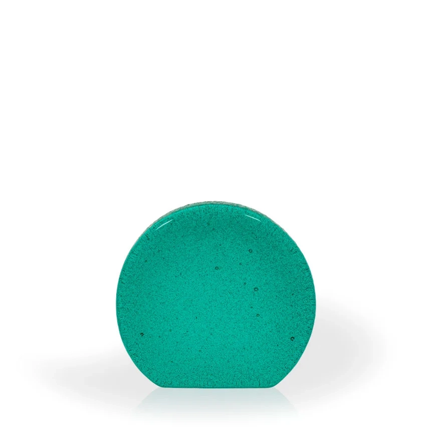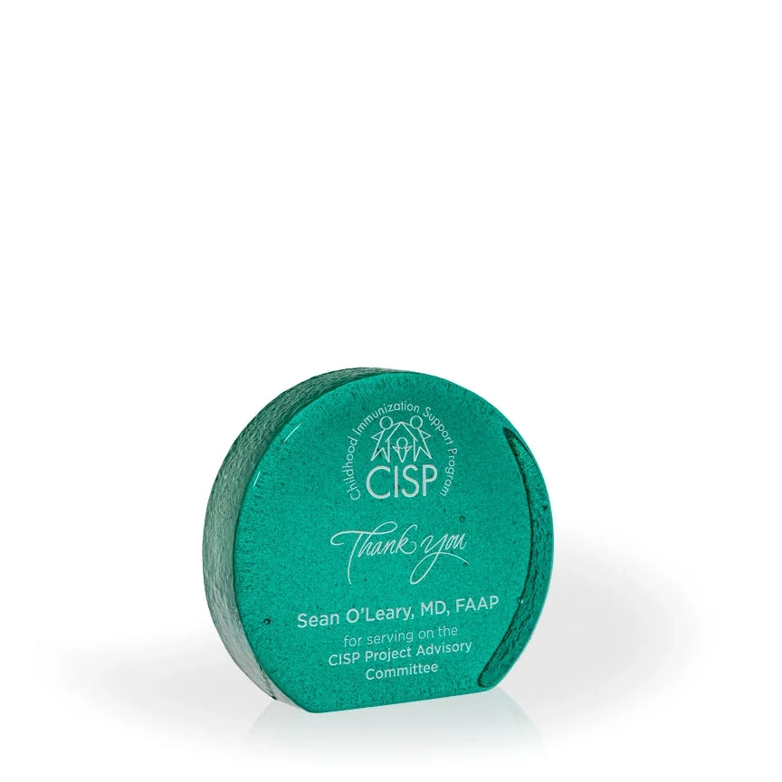 The Myst Recycled Glass Award is a stunning eco-friendly award option. This award series is made in the USA from 100% recycled glass material. The free-standing round shape allows plenty of space for etching your logo and text, and is color filled with silver for visibility. Recycled glass awards are hand made, and each piece can be slightly different in color, shape and size. Bubbles and swirls are a part of the process and are considered normal and acceptable. 4 1/2″ H x 5″ W x 1″ Thick