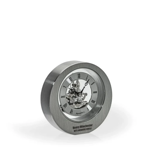 The Nako Brushed Metal Desk Clock by Thomas Dale Co. is a modern, stylized clock featuring a sleek industrial look with a body made entirely from brushed, silver tone metal. The round clock body is modern, while the clock dial floats in the center, embedded in a glass panel featuring open gearwork and large Roman numerals. This clock stands at 5.25″ tall and features a small amount a space below the clock face for adding names and gift or award information directly to the metal surface. 5.25″ H x 5.5″ W x 1.5″ D