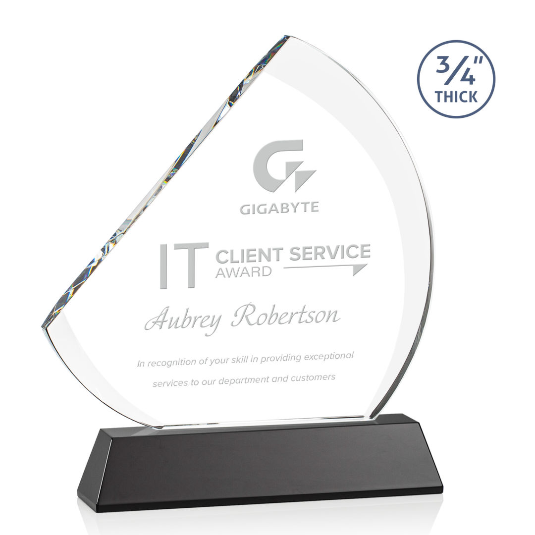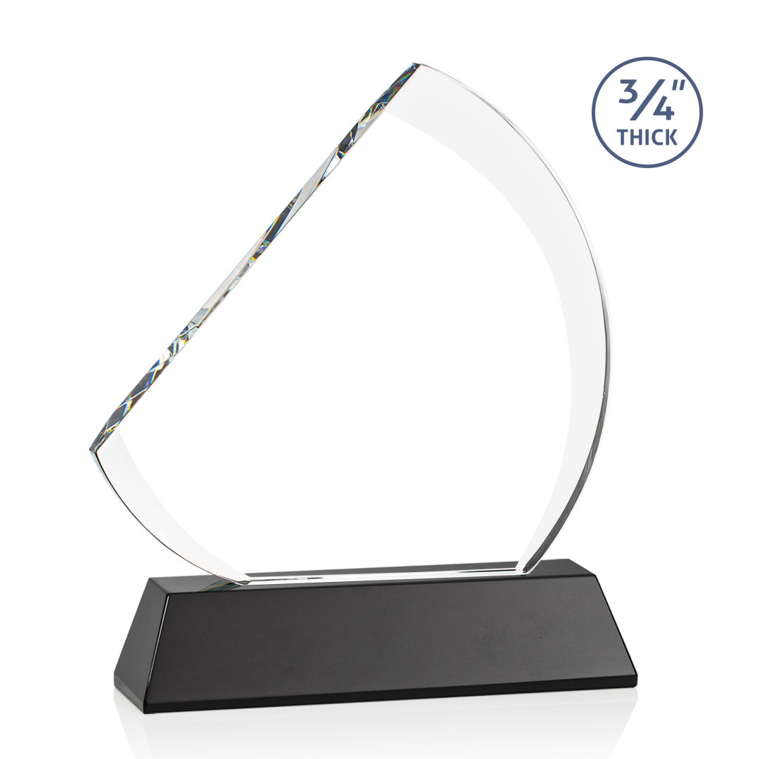 The contemporary Nantucket Award is made from thick 3/4″ Starfire Crystal with contrasting deep bevels that rise to a flat edge. This striking work of recognition is mounted on a tall emerald crystal base and is a magnificent award to honor a top performer. Second position etch optional. 7.0″ W x 8.5″ H x 2.0″ D