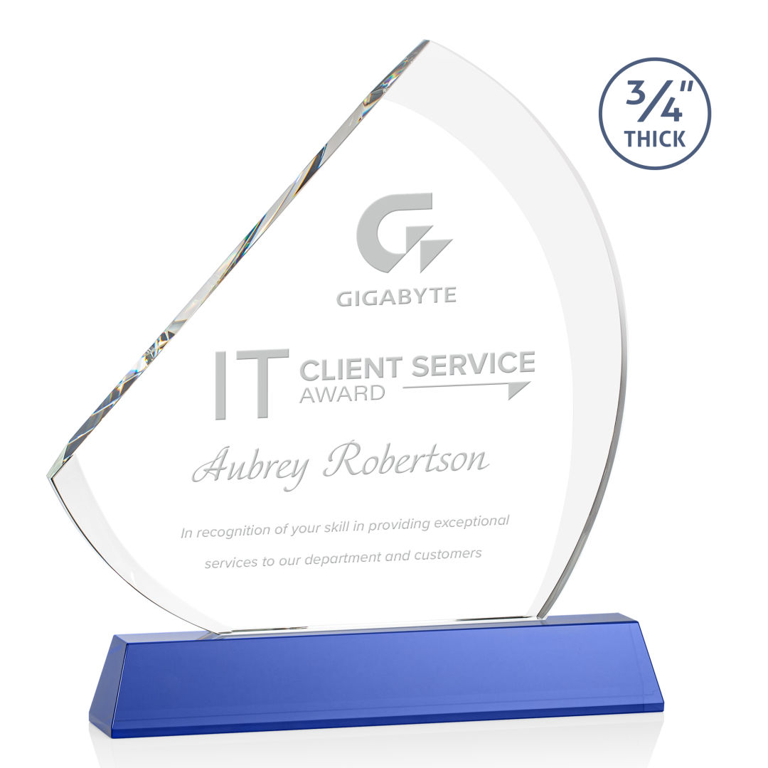 The contemporary Nantucket Award is made from thick 3/4″ Starfire Crystal with contrasting deep bevels that rise to a flat edge. This striking work of recognition is mounted on a tall sapphire crystal base and is a magnificent award to honor a top performer. Second position etch optional. 7.0″ W x 8.5″ H x 2.0″ D