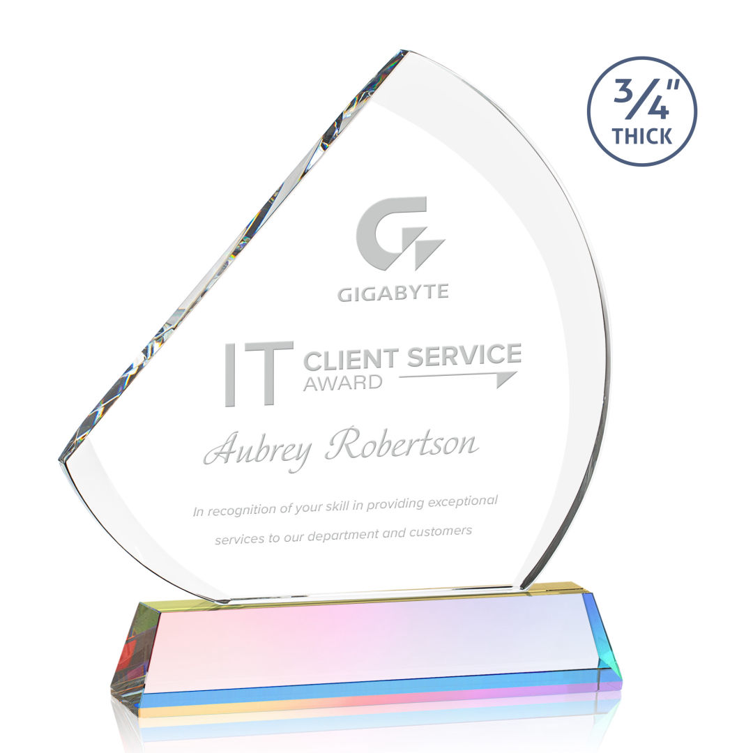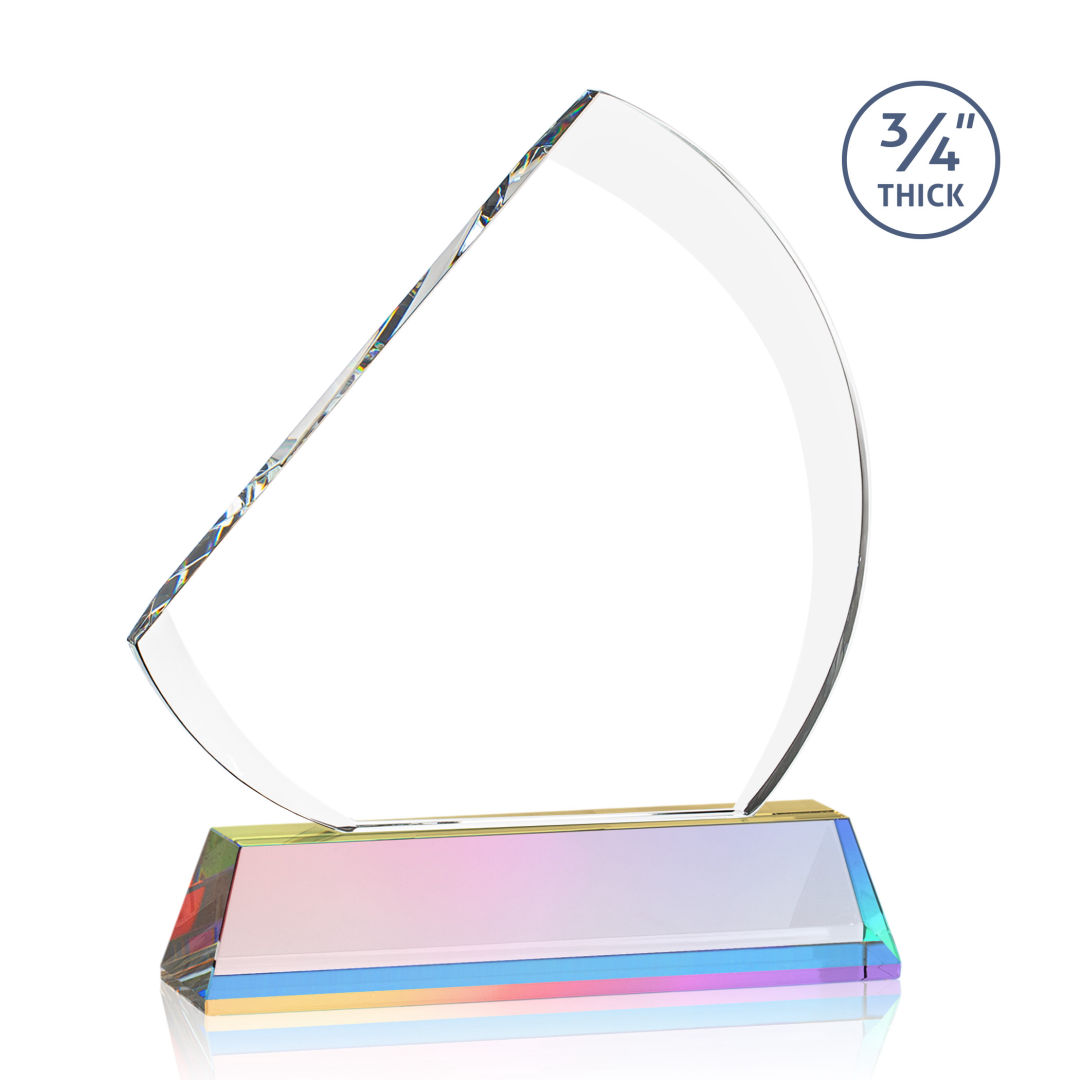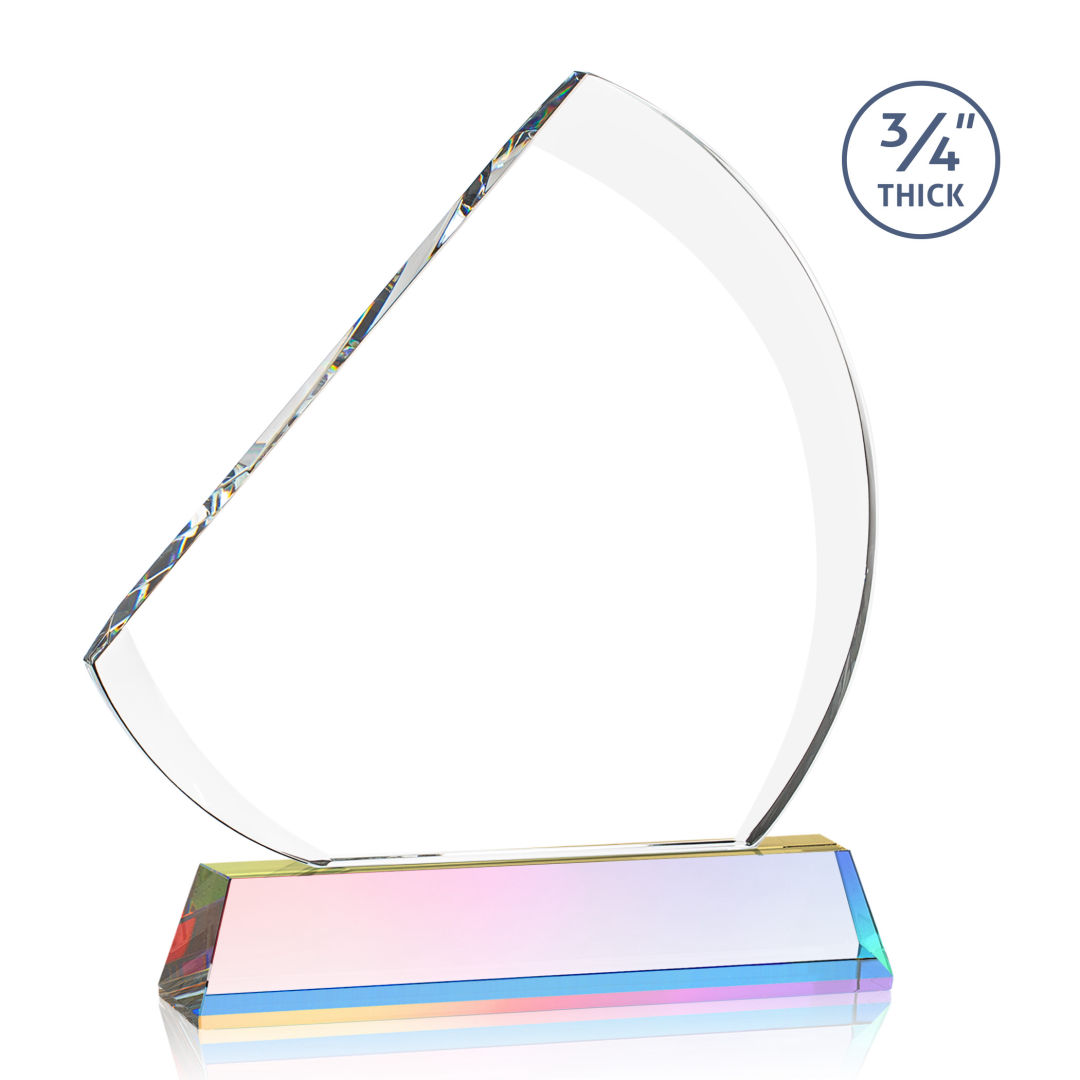 The contemporary Nantucket Award is made from thick 3/4″ Starfire Crystal with contrasting deep bevels that rise to a flat edge. This striking work of recognition is mounted on a tall prismatic crystal base and is a magnificent award to honor a top performer. Second position etch optional. 7.0″ W x 8.5″ H x 2.0″ D