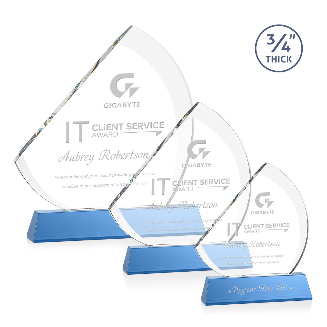 The contemporary Nantucket Award is made from thick 3/4″ Starfire Crystal with contrasting deep bevels that rise to a flat edge. This striking work of recognition is mounted on a tall sky blue crystal base and is a magnificent award to honor a top performer. Second position etch optional. 7.0″ W x 8.5″ H x 2.0″ D