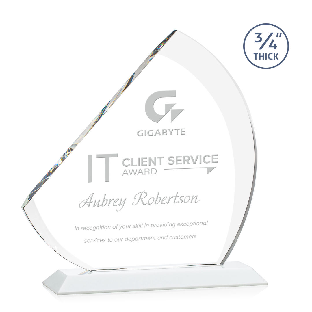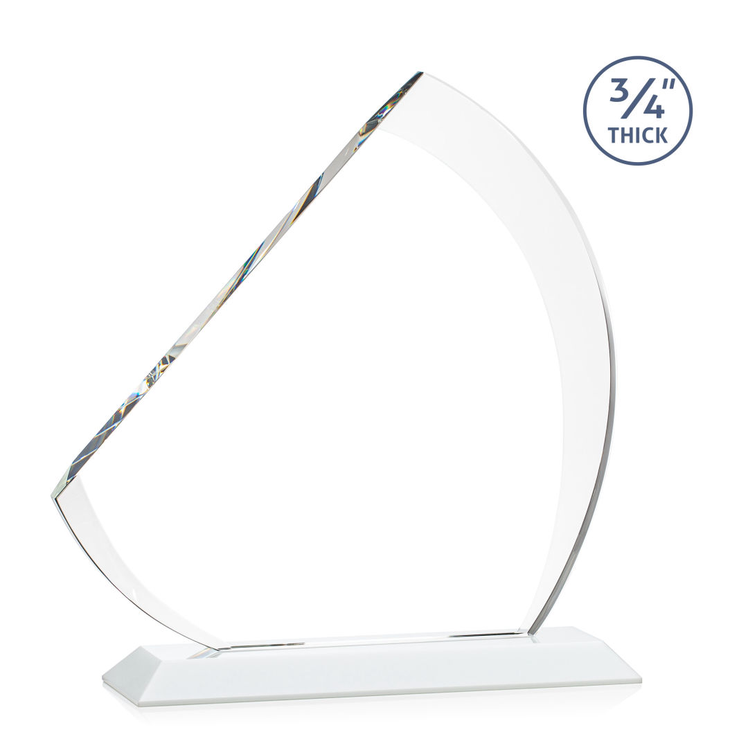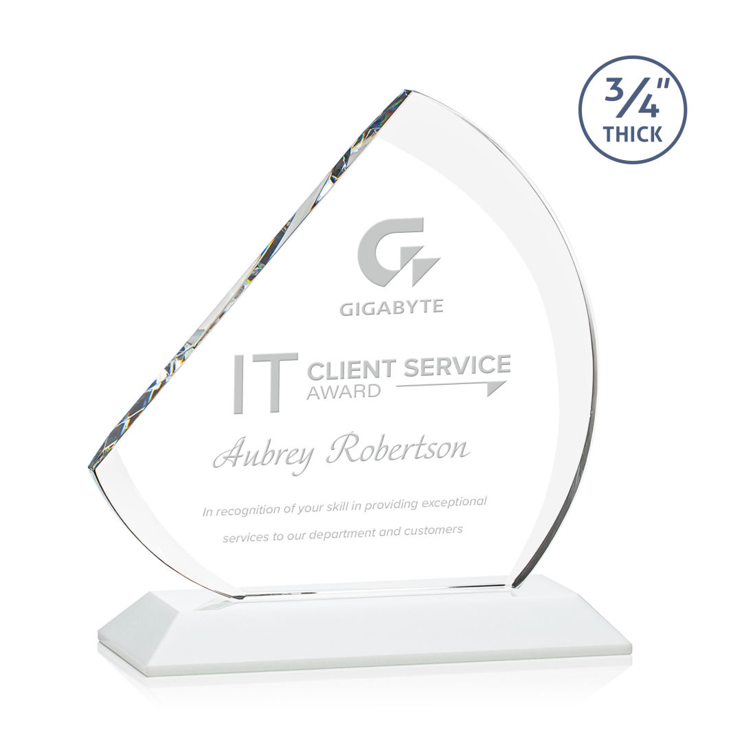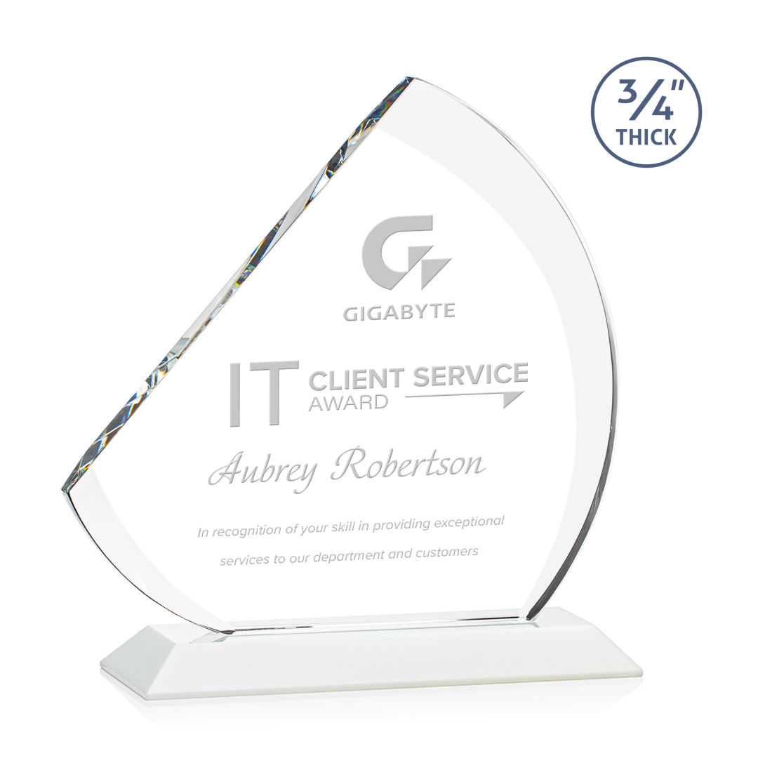 The contemporary Nantucket Award is made from thick 3/4″ Starfire Crystal with contrasting deep bevels that rise to a flat edge. This striking work of recognition is mounted on a solid white crystal base and is a magnificent award to honor a top performer. 7.0″ W x 7.75″ H x 3.0″ D