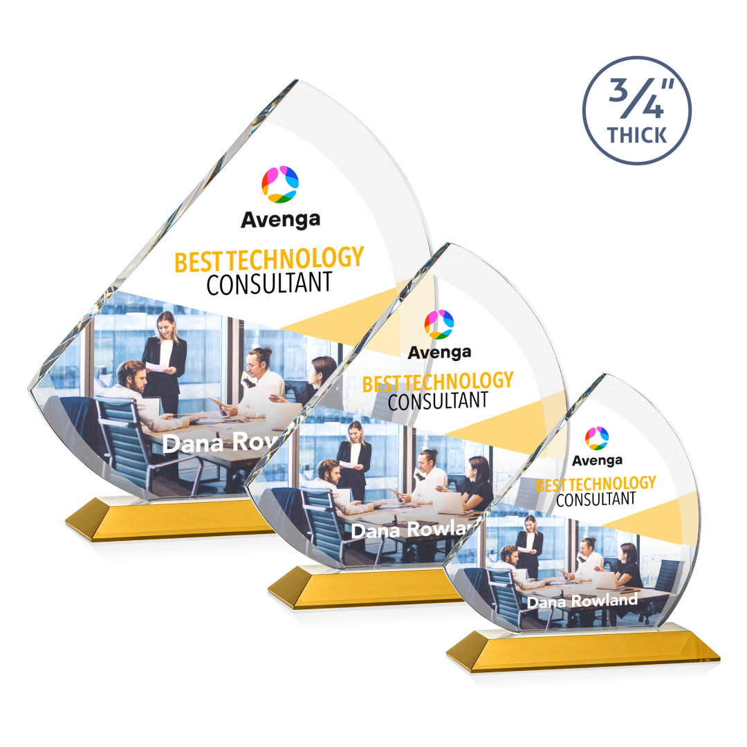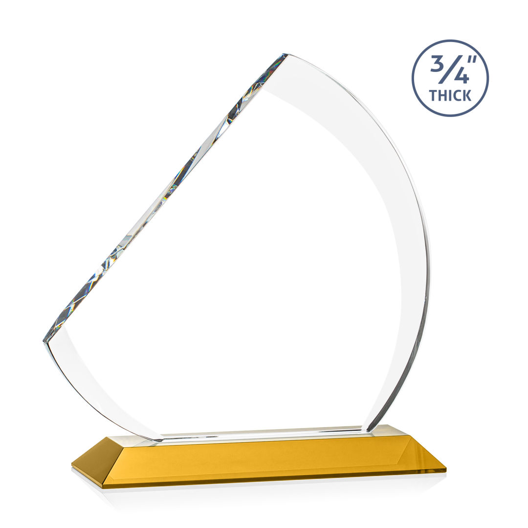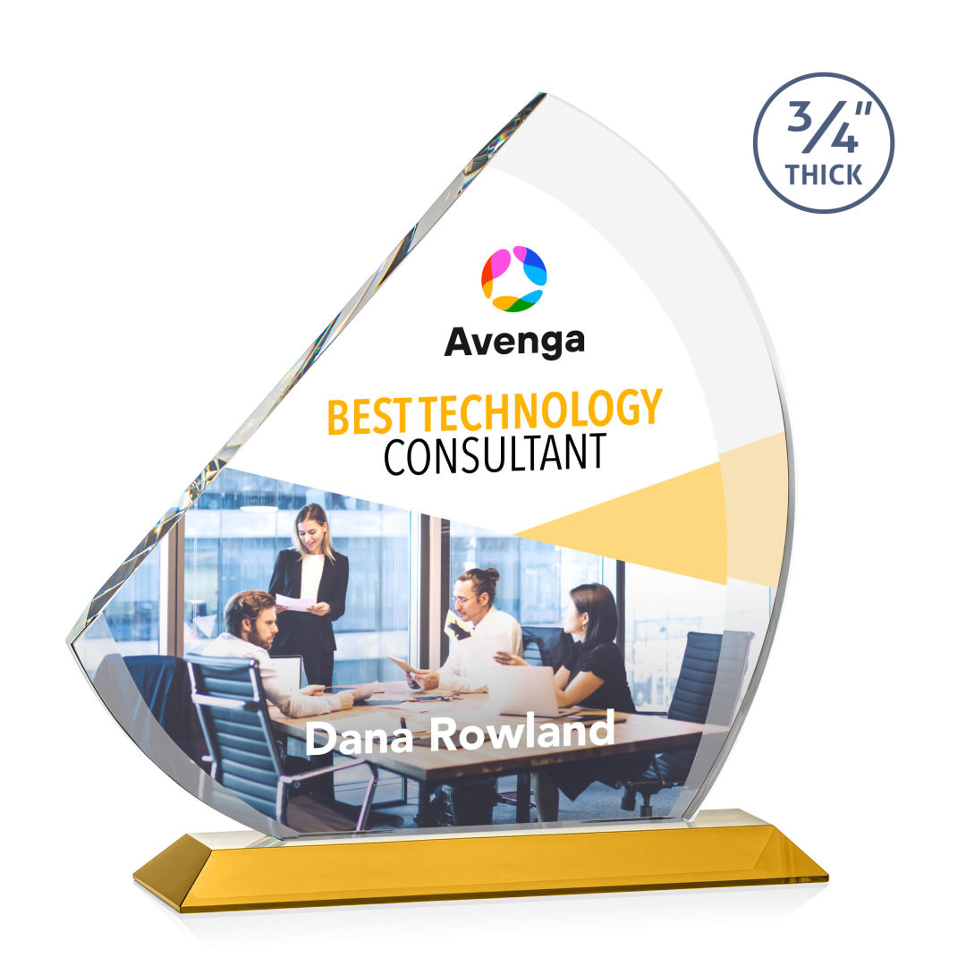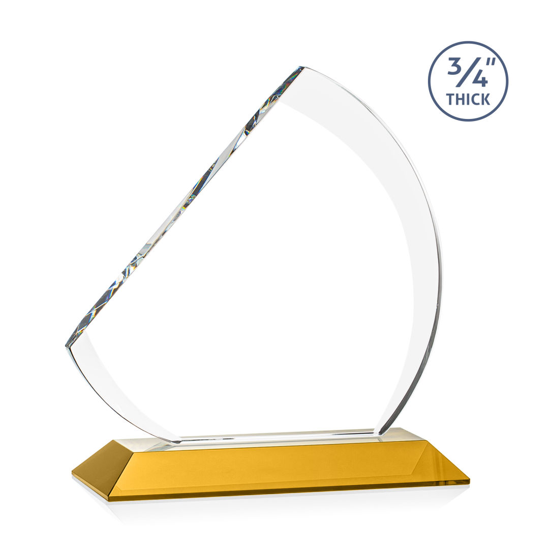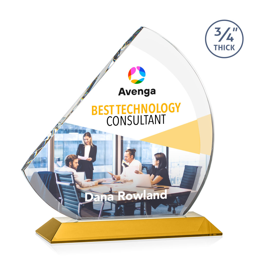 The contemporary Nantucket VividPrint™ Award is made from thick 3/4″ Starfire Crystal with contrasting deep bevels that rise to a flat edge. This striking work of recognition is mounted on an amber crystal base and is a magnificent award to honor a top performer. 7.0″ W x 7.75″ H x 3.0″ D