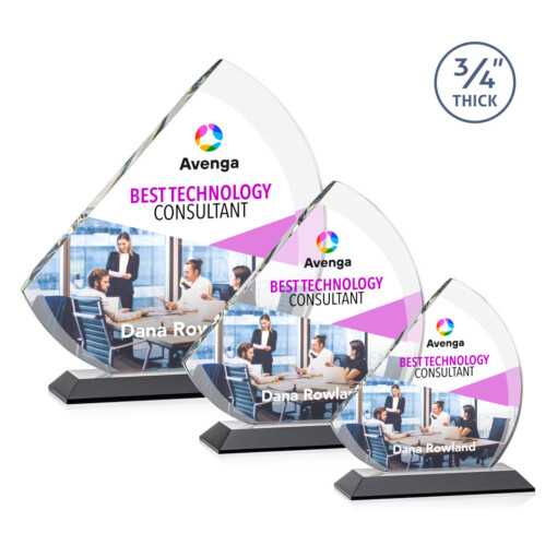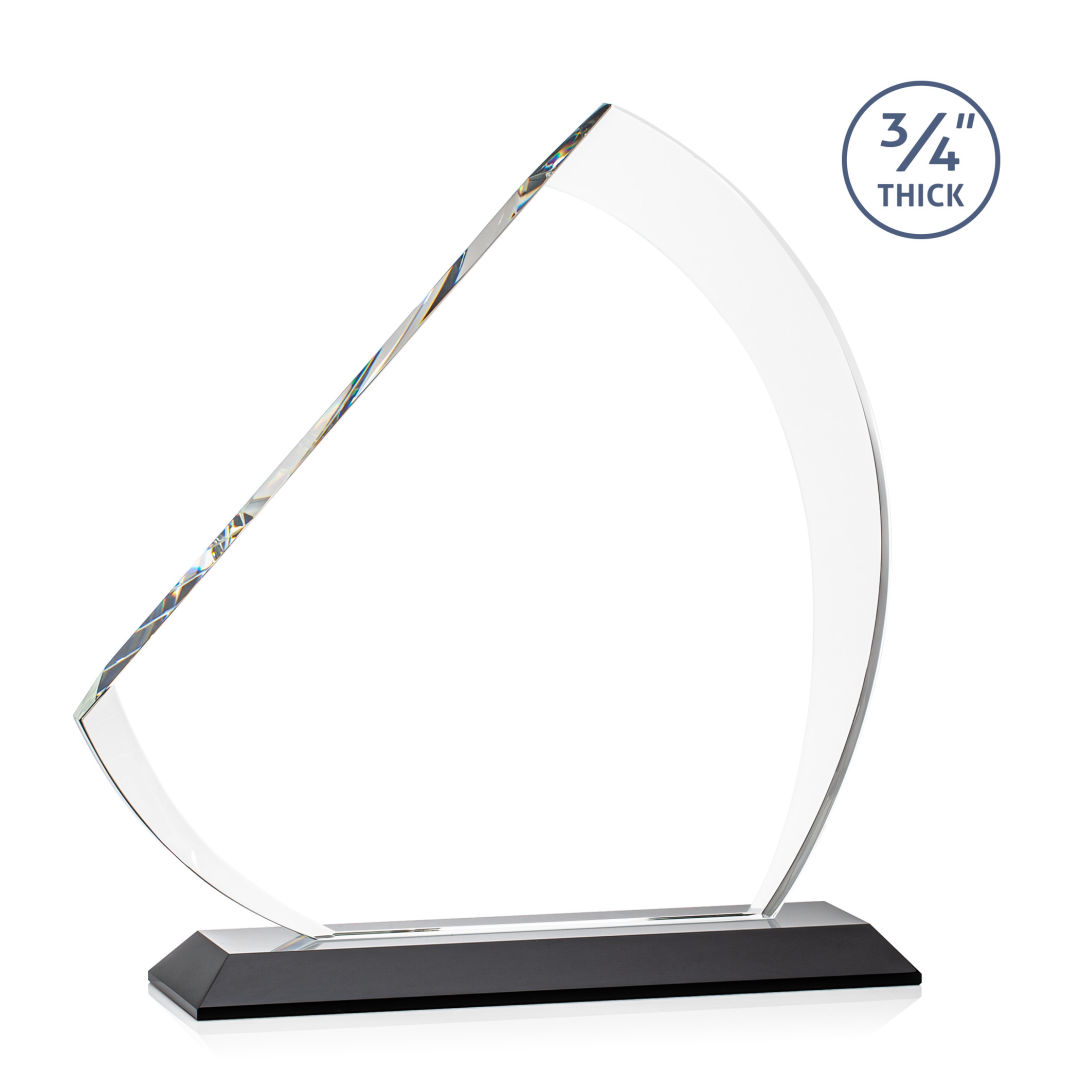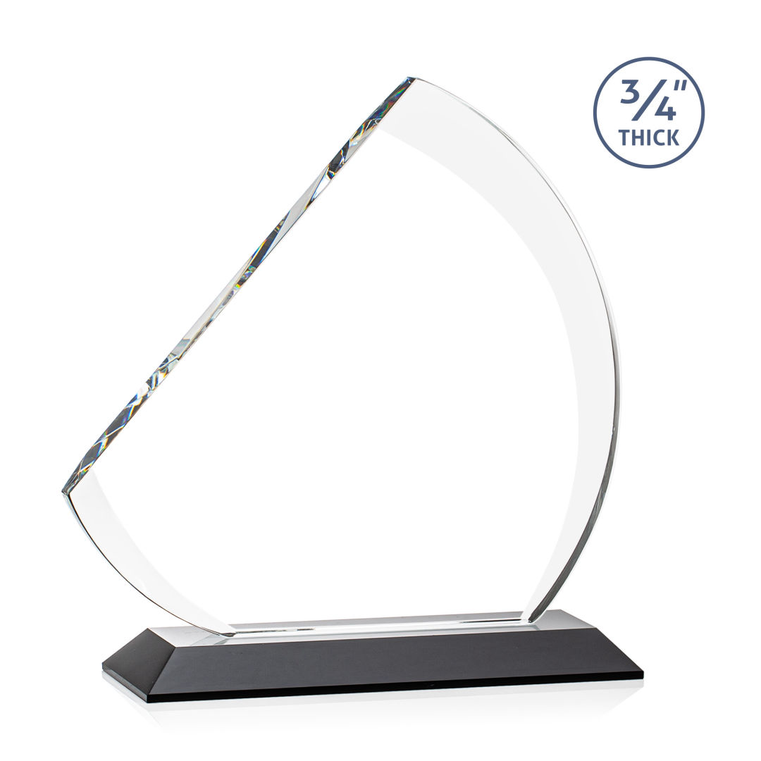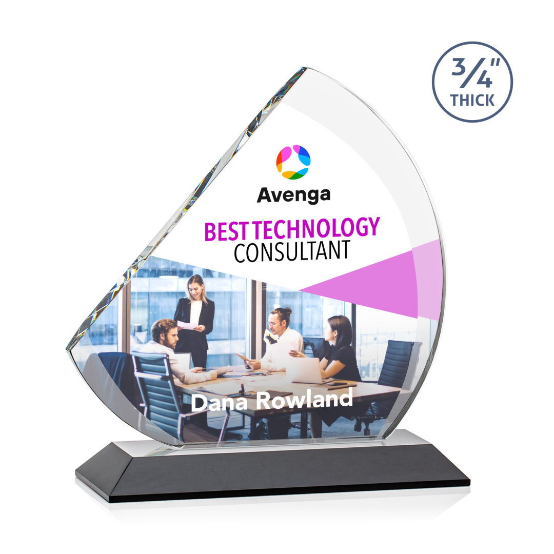The contemporary Nantucket VividPrint™ Award is made from thick 3/4″ Starfire Crystal with contrasting deep bevels that rise to a flat edge. This striking work of recognition is mounted on an ebony crystal base and is a magnificent award to honor a top performer. 7.0″ W x 7.75″ H x 3.0″ D