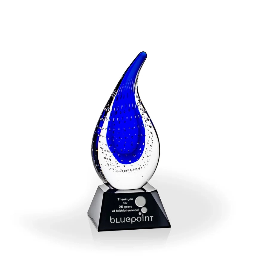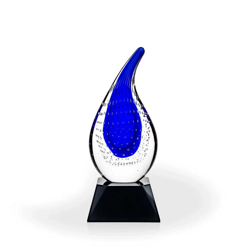 The Natoma Flame Art Glass Award is a pretty blue and teal colored art glass award that sits atop clear base. It’s shape resembles a flame or a raindrop. Art glass awards are great options when you want to add really unique and colorful awards to your recognition program. Gold or silver color fill can be added to the engraving for an additional cost.Art glass awards are hand blown, and each piece will be slightly different in color, shape and size. Bubbles and swirls are a part of the process. 12″ H x 4″ W x 4″ D