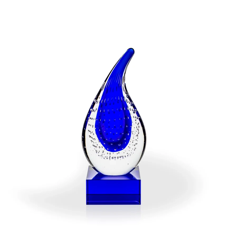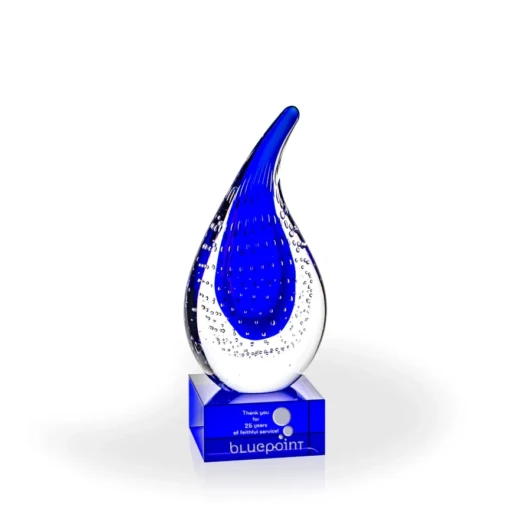 The Natoma Flame Art Glass Award is a striking blue art glass award that sits atop a blue crystal base. It’s shape resembles a flame or a raindrop. The text will be silver filled for readability. Art glass awards are hand blown, and each piece will be slightly different in color, shape, and size. Bubbles and swirls are a part of the process and are considered normal and acceptable. 9.25″ H x 4″ W x 3.25″ D