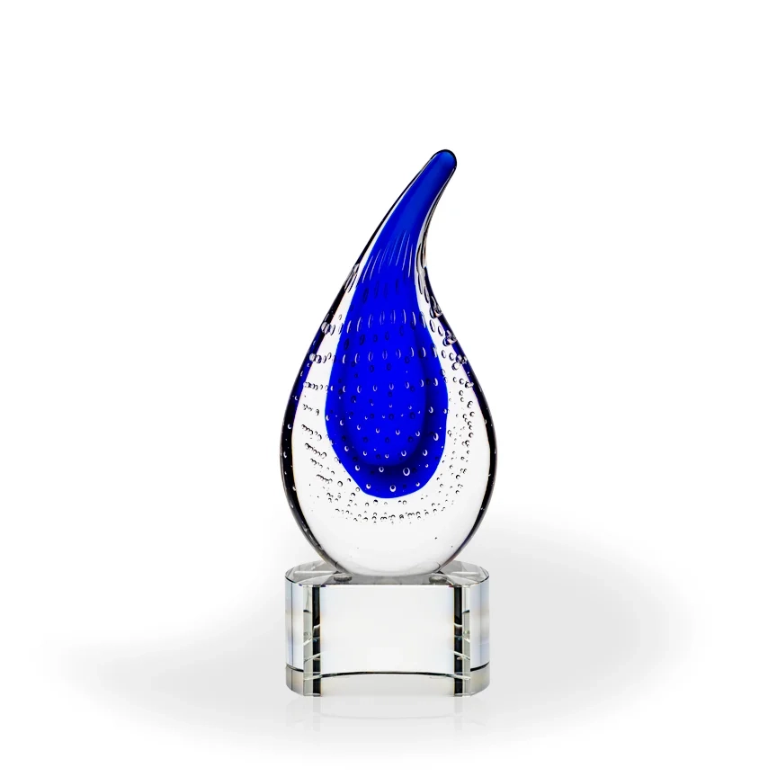 The Natoma Flame Art Glass Award is a pretty blue and teal colored art glass award that sits atop clear base. It’s shape resembles a flame or a raindrop. Art glass awards are great options when you want to add really unique and colorful awards to your recognition program. Gold or silver color fill can be added to the engraving for an additional cost.Art glass awards are hand blown, and each piece will be slightly different in color, shape and size. Bubbles and swirls are a part of the process. 10″ H x 4″ W x 4″ D