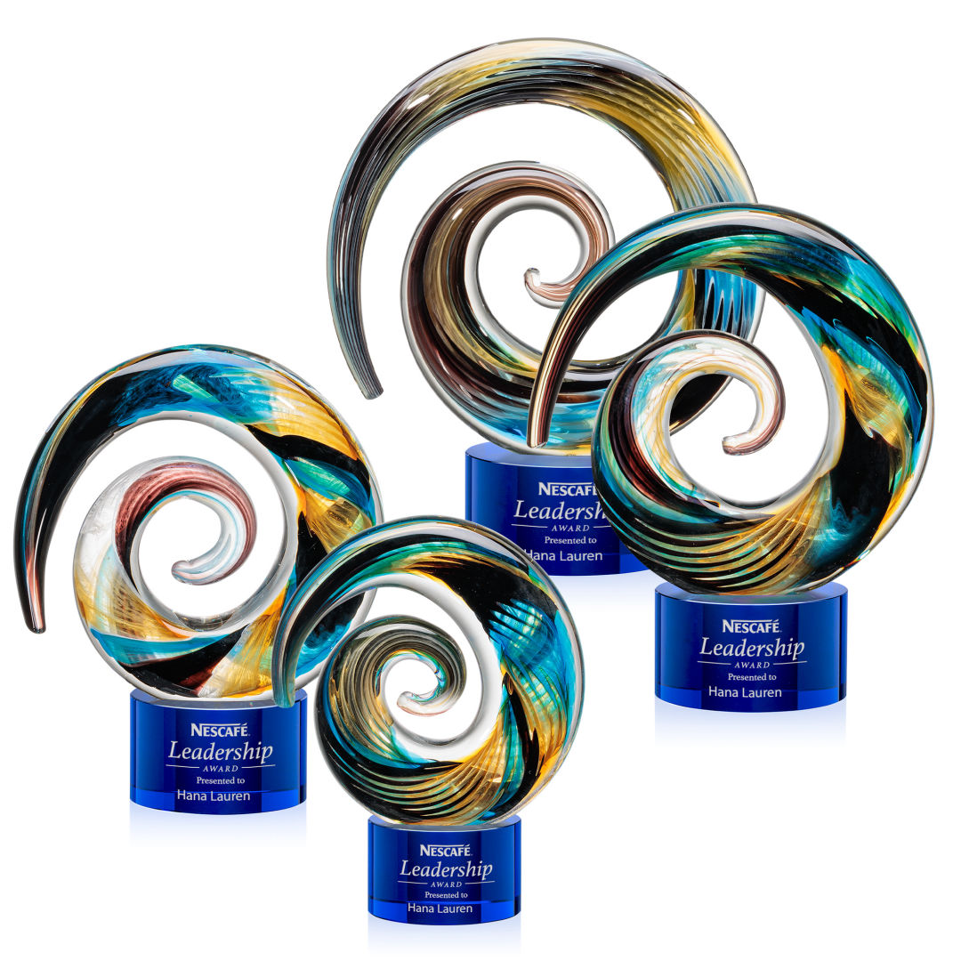 The Nazare Award is a truly unique gallery-quality hand-blown work of art. This seashell-like showstopping centerpiece features swirls of aqua, amber, and deep burgundy and is perched on a complimenting optical sapphire crystal base for personalization with a logo or name. Each piece is individually Hand-crafted. No two pieces are alike. All sizes are approximate and will vary from piece to piece. Packaged in a black satin-lined presentation gift box. 5.0″ W x 6.5″ H x 2.5″ D