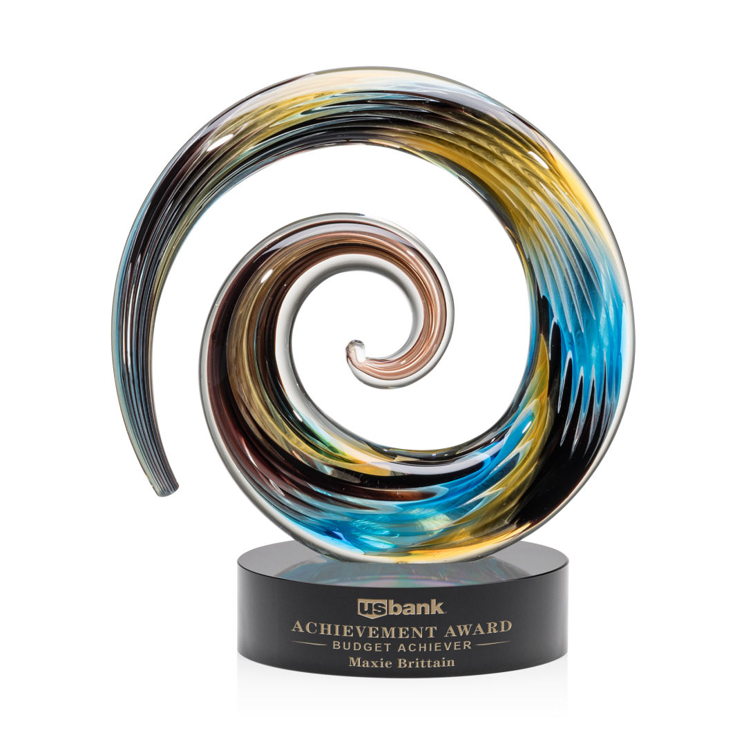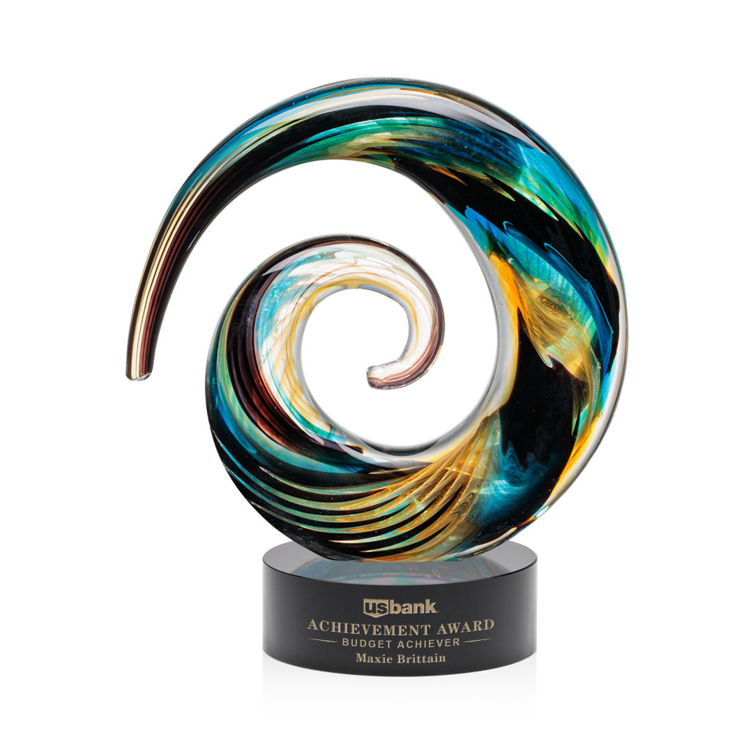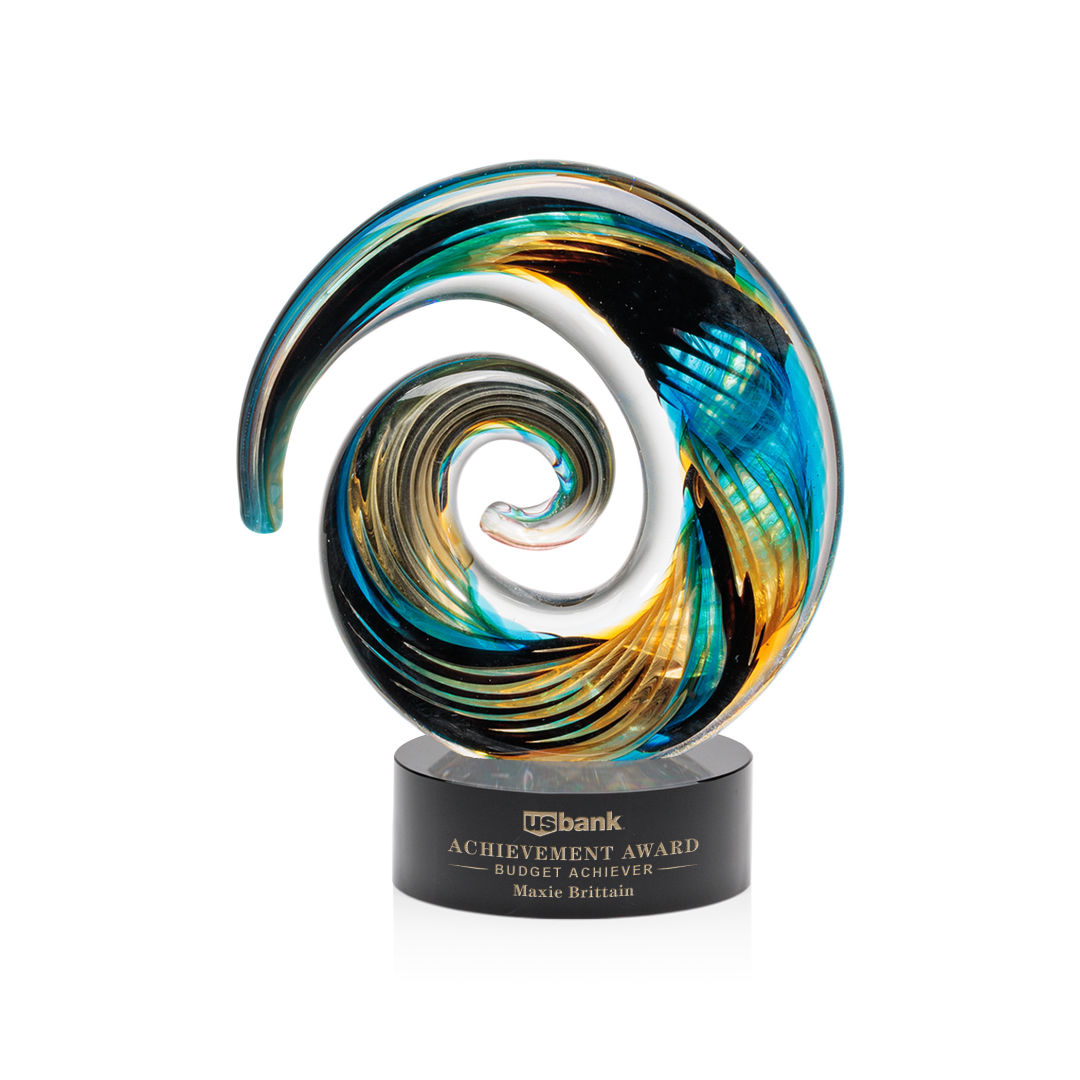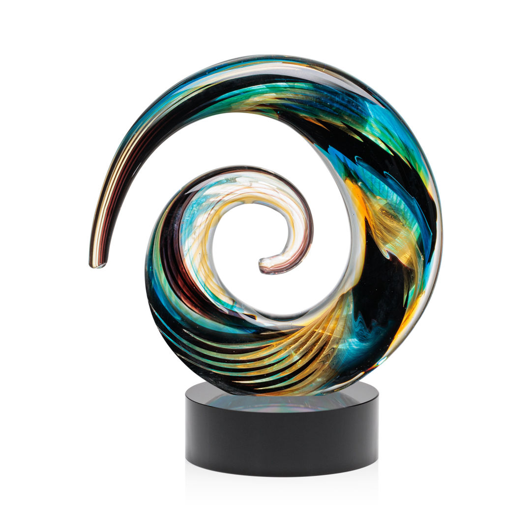 The Nazare Award is a truly unique gallery-quality hand-blown work of art. This seashell-like showstopping centerpiece features swirls of aqua, amber, and deep burgundy and is perched on a complimenting optical ebony crystal base for personalization with a logo or name. Each piece is individually Hand-crafted. No two pieces are alike. All sizes are approximate and will vary from piece to piece. Packaged in a black satin-lined presentation gift box. 5.0″ W x 6.0″ H x 3.5″ D