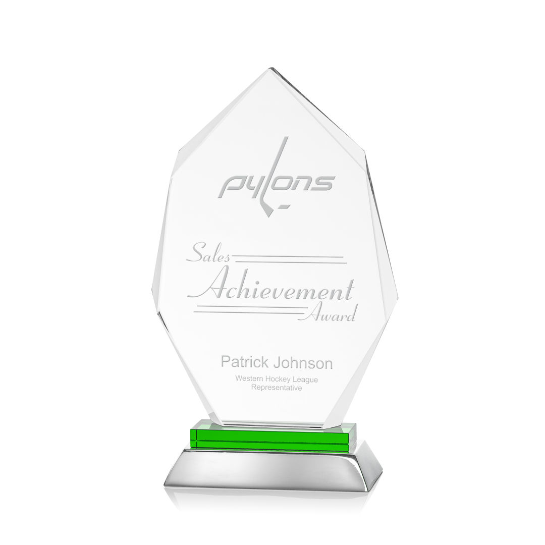 The interchanging facets on the Nebraska Award reflect light and create a sparkling frame for your incredible achievement. Mounted on an emerald crystal and polished aluminum double base. 4.75″ W x 10.5″ H
