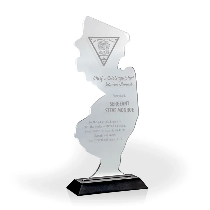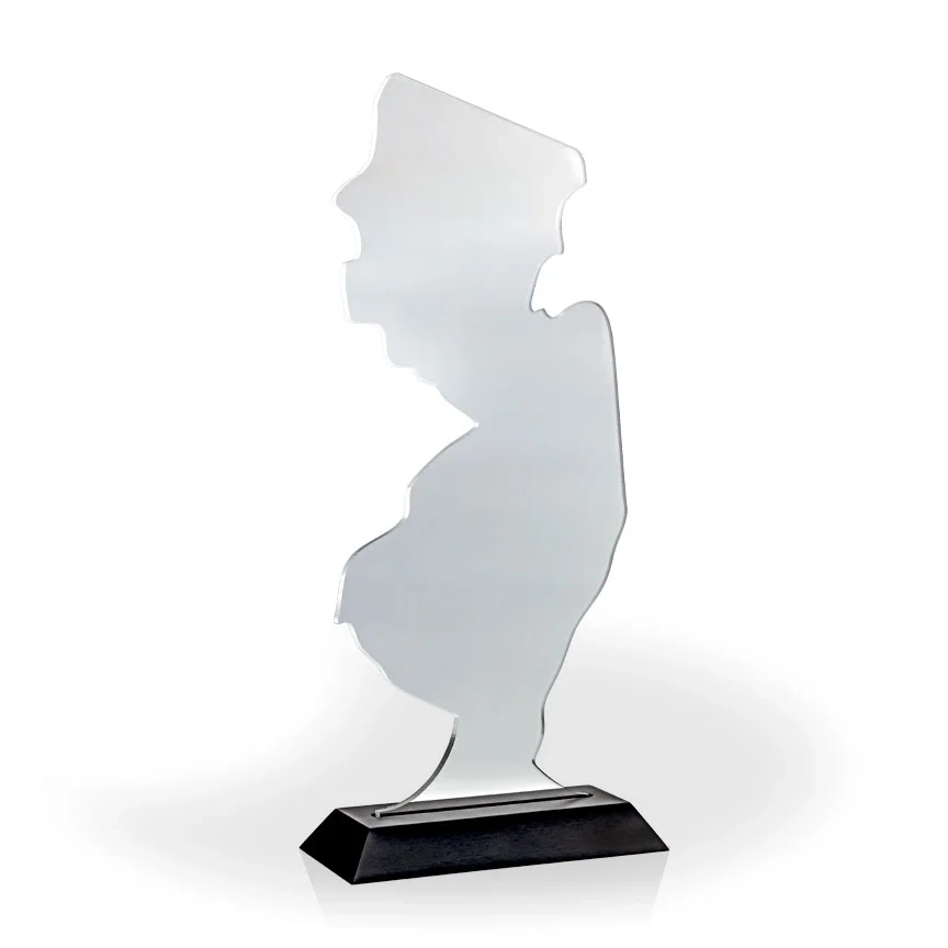 An attractive and affordable award option, our acrylic cutout awards are made in the USA with 1/4″ clear acrylic and a black, beveled wood base. These budget-friendly awards require minor assembly. The acrylic pop-in and wood base are packaged together, un-attached, in a slim-line white tri-fold box. 9″ H x 3.6″ W x 2″ D