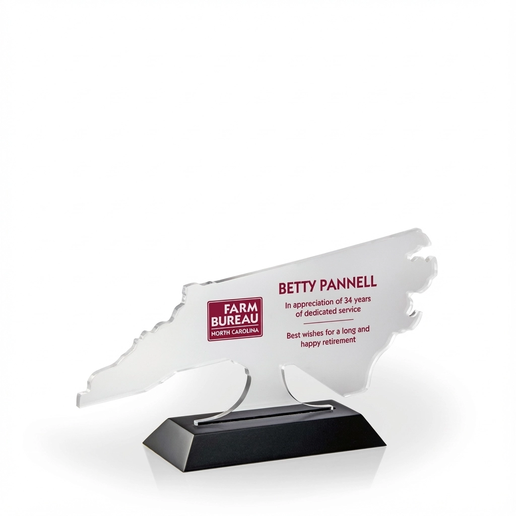 An attractive and affordable award option, our acrylic cutout awards are made in the USA with 1/4″ clear acrylic and a black, beveled wood base. These budget-friendly awards require minor assembly. The acrylic pop-in and wood base are packaged together, un-attached, in a slim-line white tri-fold box. 4.25″ H x 8″ W x 2″ D