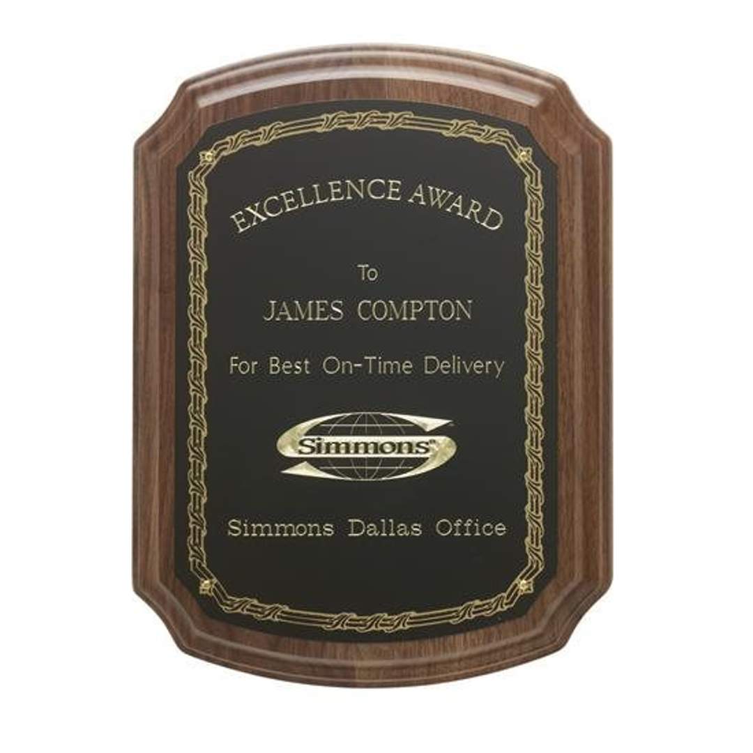 This unique notched corner American walnut plaque features a triple ridged ogee edge and holds a black brass plate with an elegant gold Grecian wrapped border. 6.0″ W x 8.0″ H