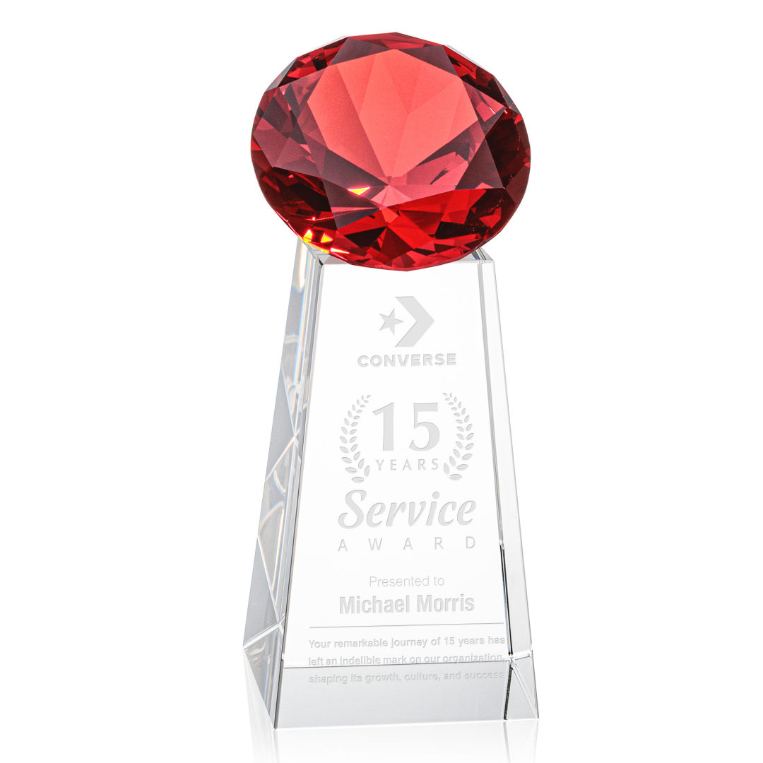 The statuesque and sparkling Optical Crystal Novita Award tapers up from its tall squared base in triumph to present its stunning mounted gemstone. Available in beautiful shades of ruby, sapphire, emerald, amber, and clear. 2.5″ W x 6.0″ H x 2.5″ D