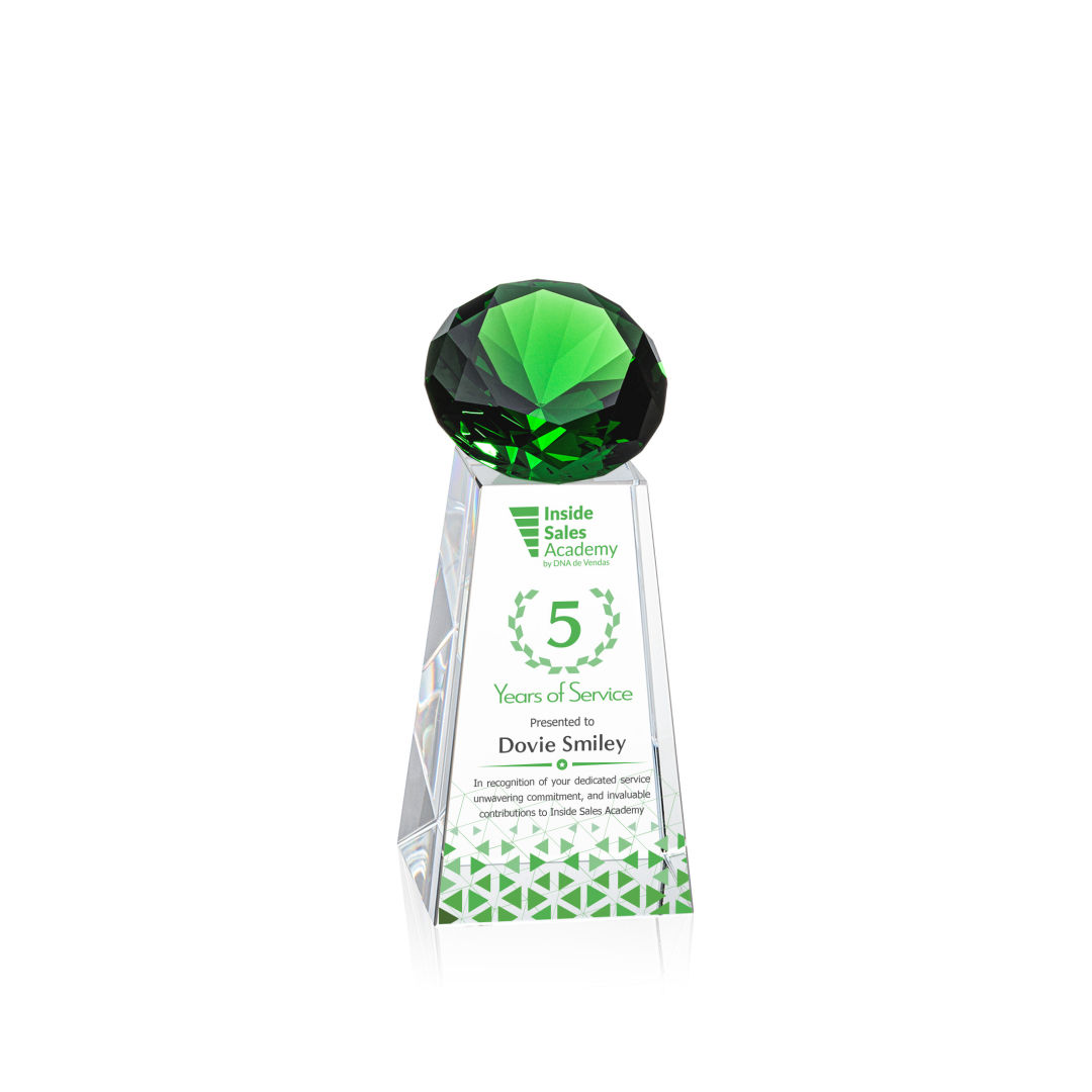 The statuesque and sparkling Optical Crystal Novita VividPrint™ Award tapers up from its tall squared base in triumph to present its stunning mounted gemstone. Available in beautiful shades of ruby, sapphire, emerald, amber, and clear. 2.5″ W x 6.0″ H x 2.5″ D