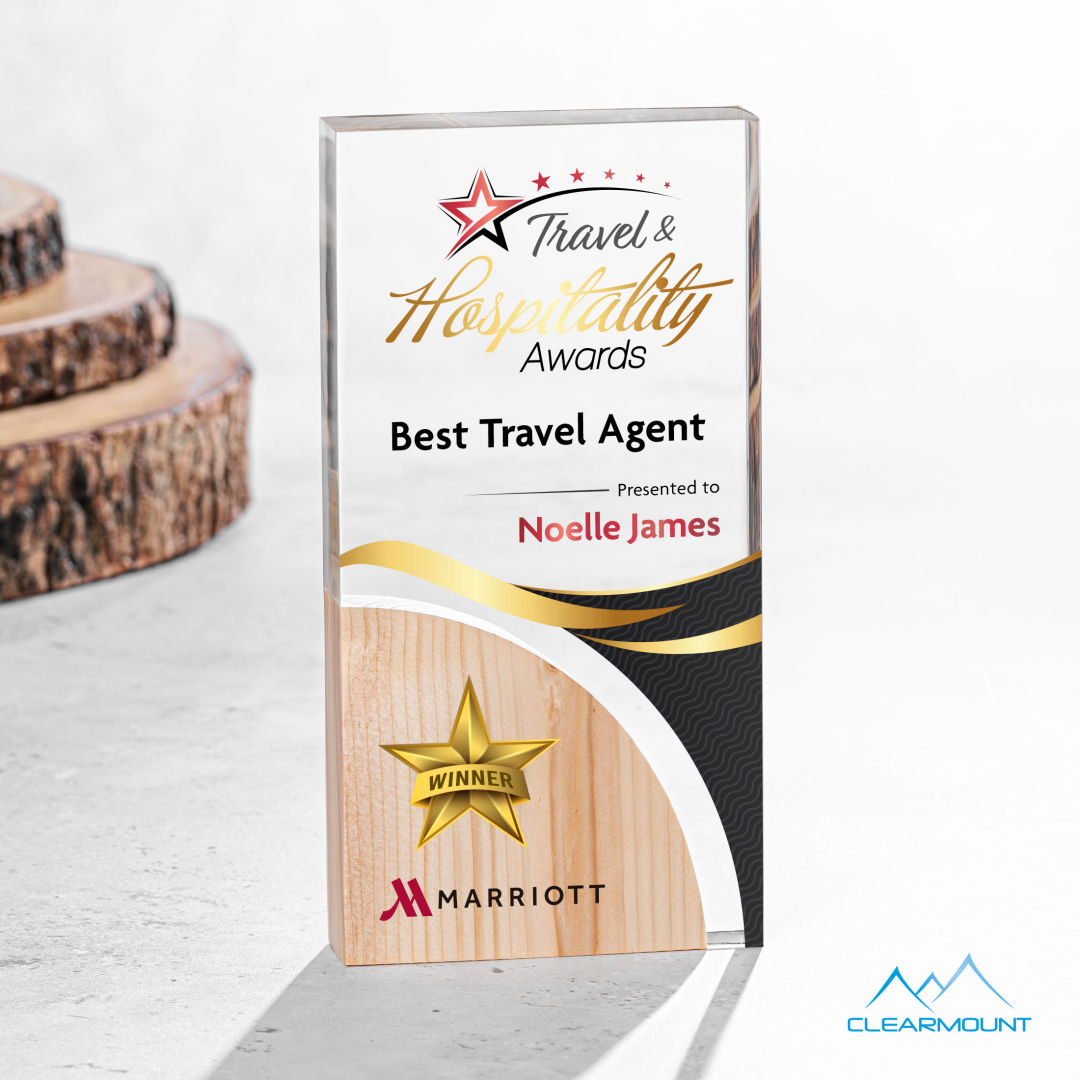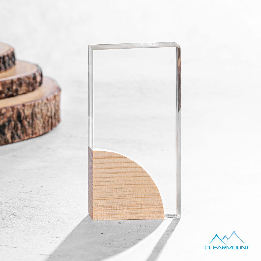 The Nuage VividPrint™ Award is a masterpiece that seamlessly combines modern aesthetics with the timeless allure of natural wood. This captivating recognition piece features a sleek acrylic design crowned with a distinctive wooden quarter circle nestled in the bottom corner, creating a visually striking and harmonious composition. Take your artwork to new heights with full-color VividPrint™. 3.0″ W x 6.0″ H x 1.0″ D